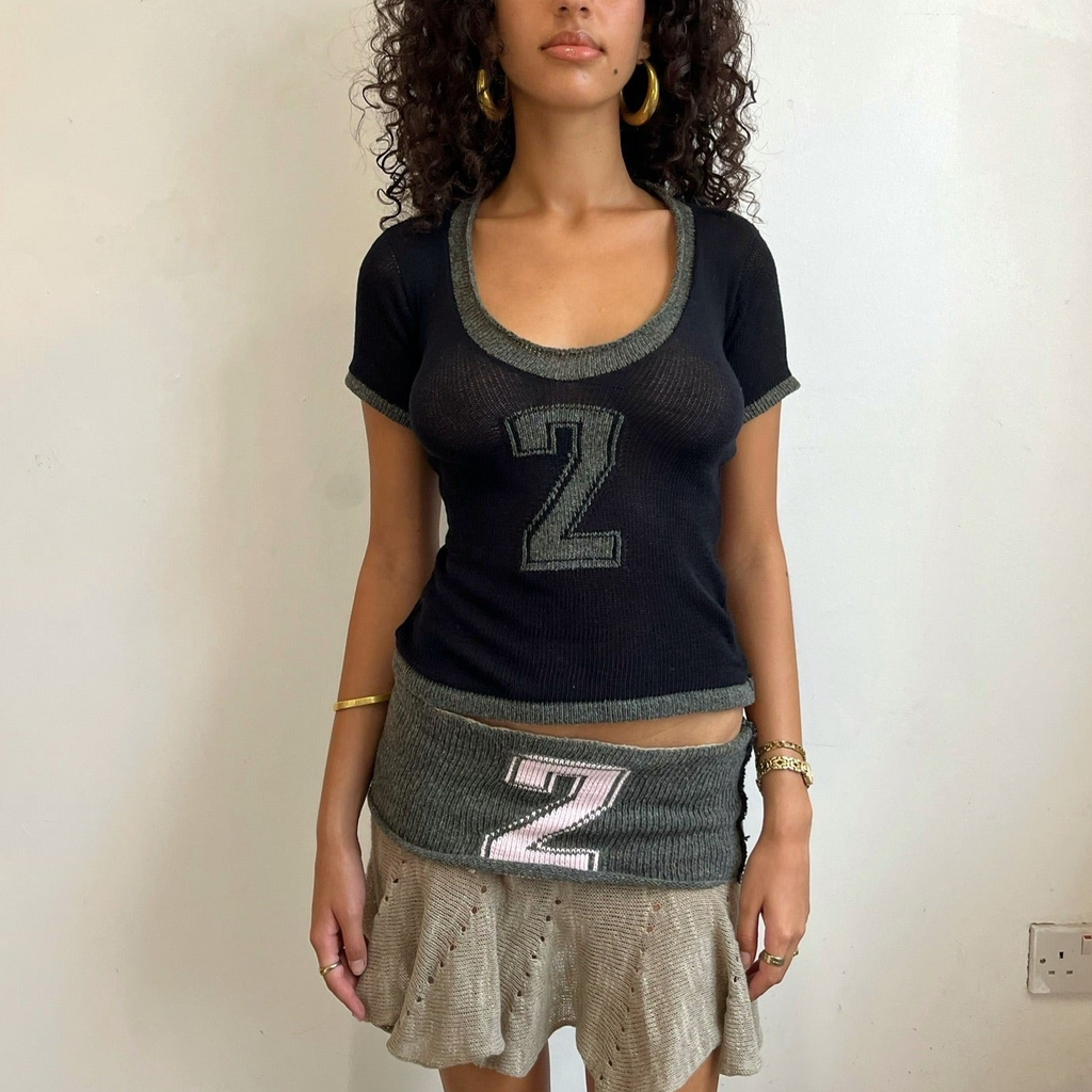 Linen/cotton blend Ruffle knit mini skirt featuring a recycled wool fold down waistband.