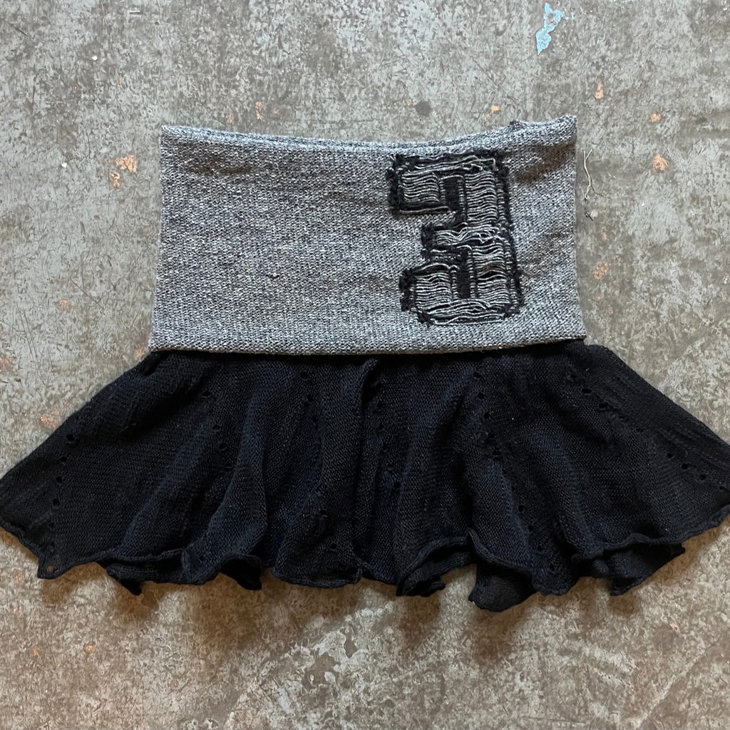 Linen/cotton blend Ruffle knit mini skirt featuring a recycled wool fold down waistband.