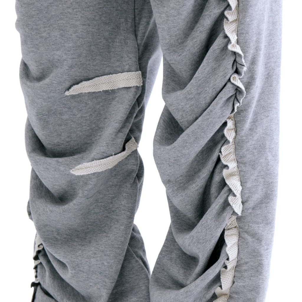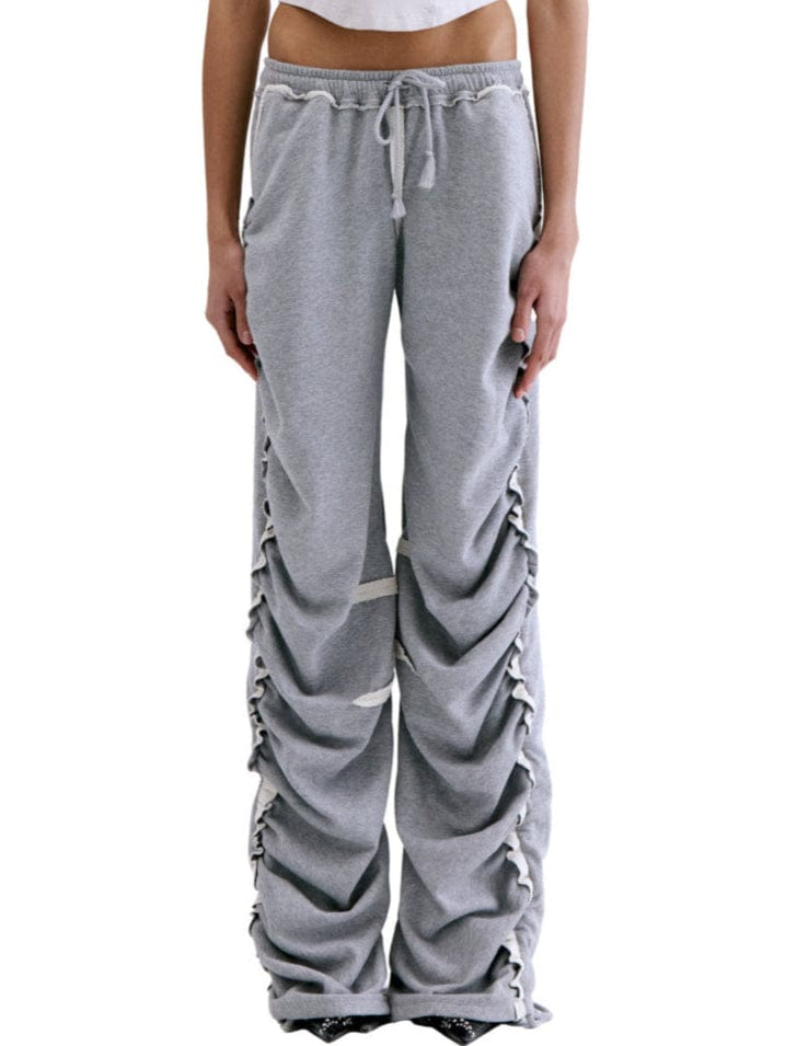 Long ruffle sweatpants with side pockets, exposed seams, adjustable length and drawstrings