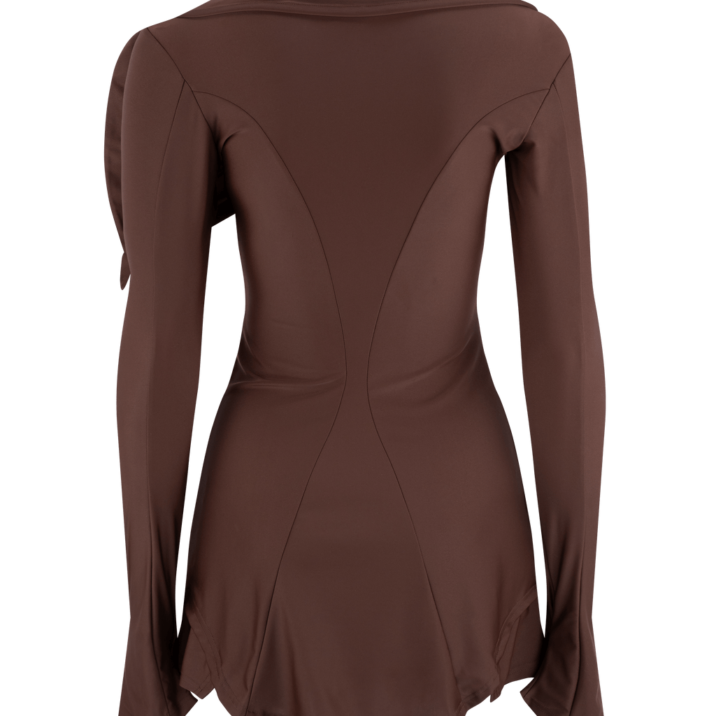 Lightweight Lycra button up dress. Open neckline with extended lapel designed to drape over the shoulder. With button to hold collar down, to always expose the shoulder.Buttoned cuff opening. Metal Buttons. Added side panels to give the effect of a shirt under a shirt.