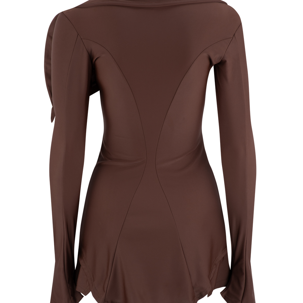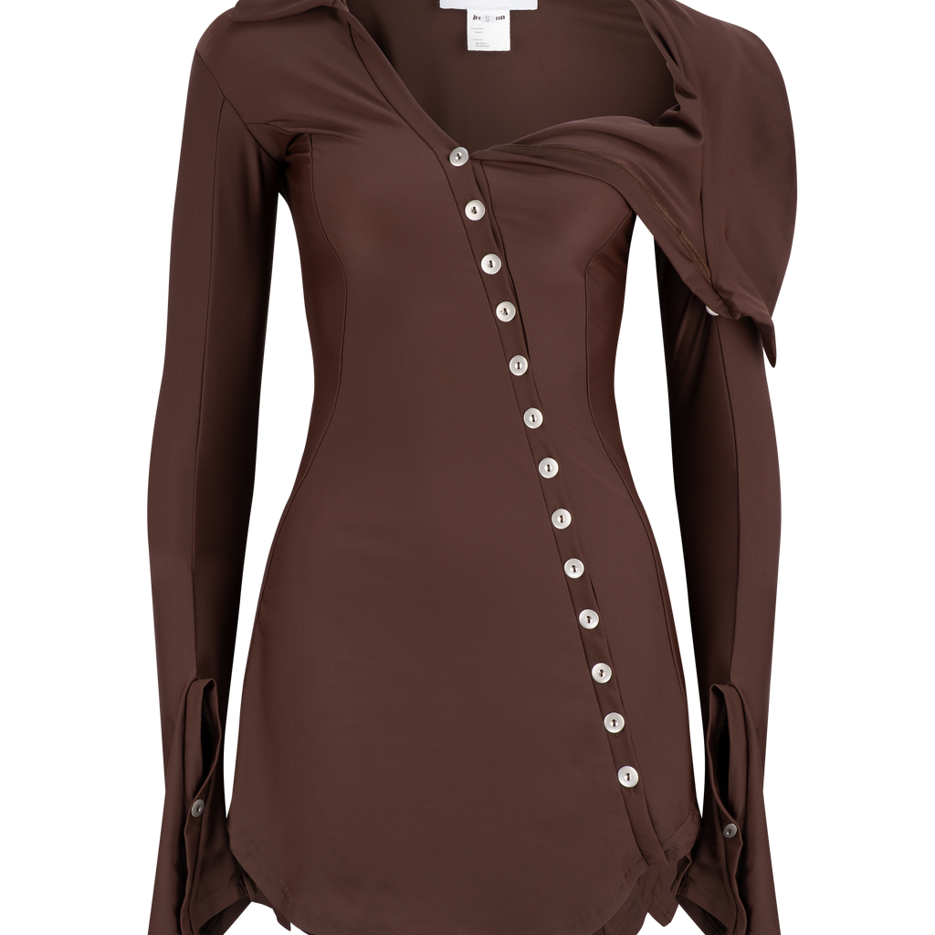 Lightweight Lycra button up dress. Open neckline with extended lapel designed to drape over the shoulder. With button to hold collar down, to always expose the shoulder.Buttoned cuff opening. Metal Buttons. Added side panels to give the effect of a shirt under a shirt.