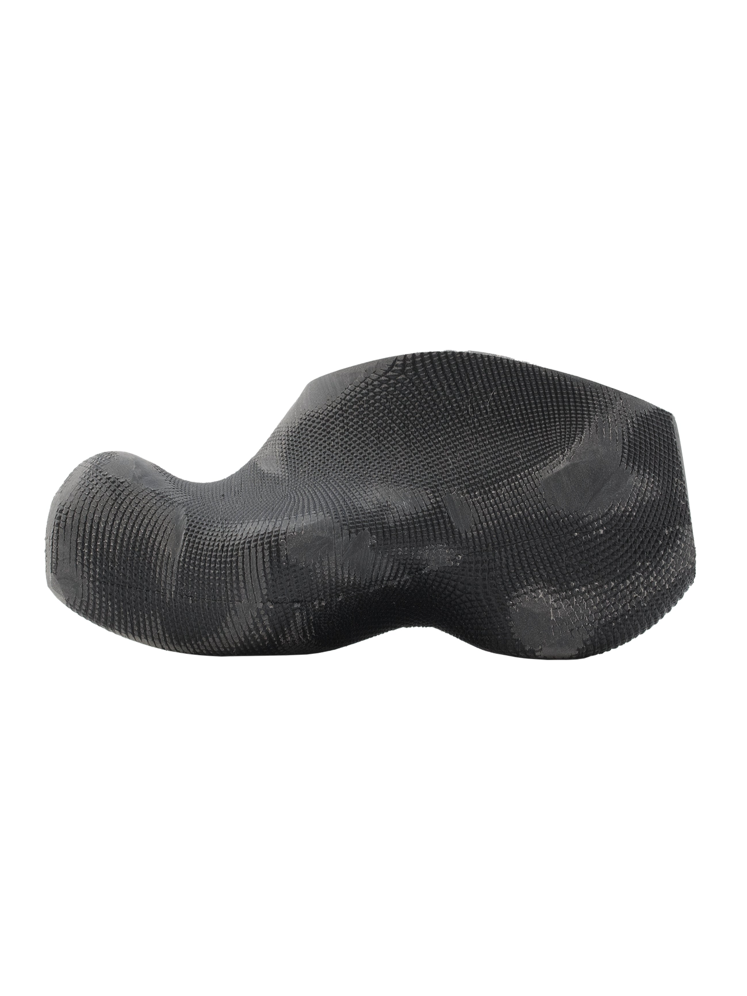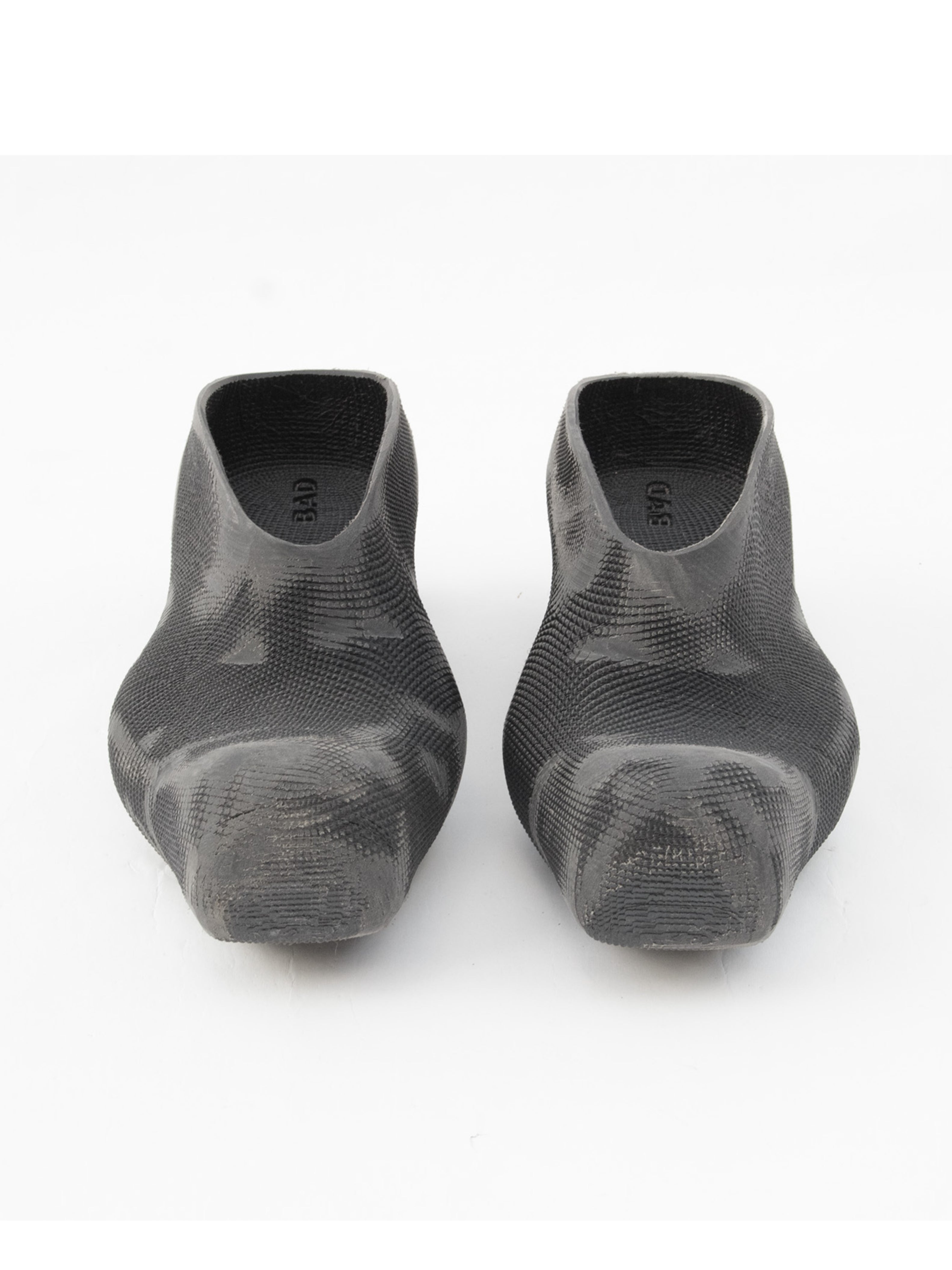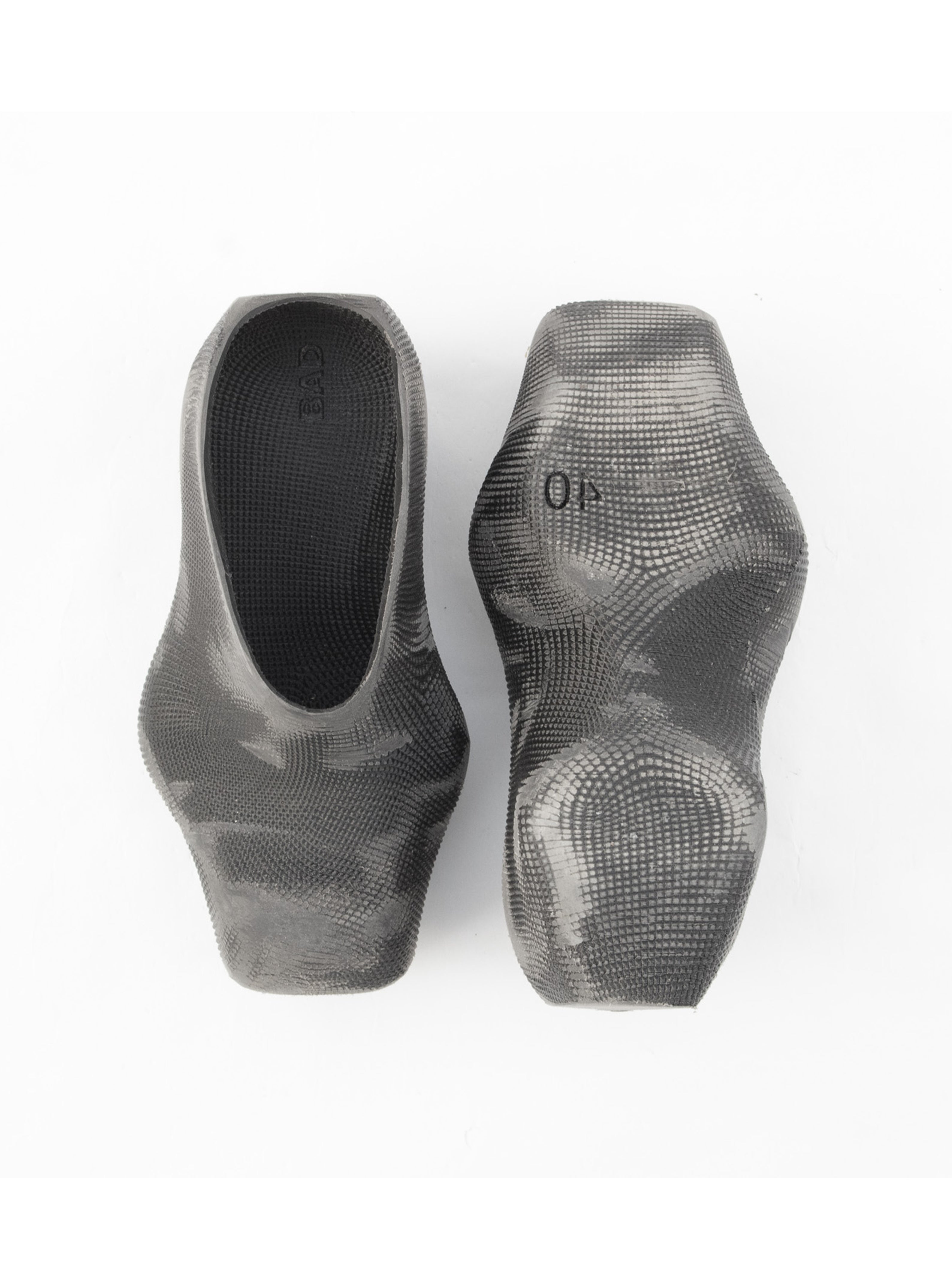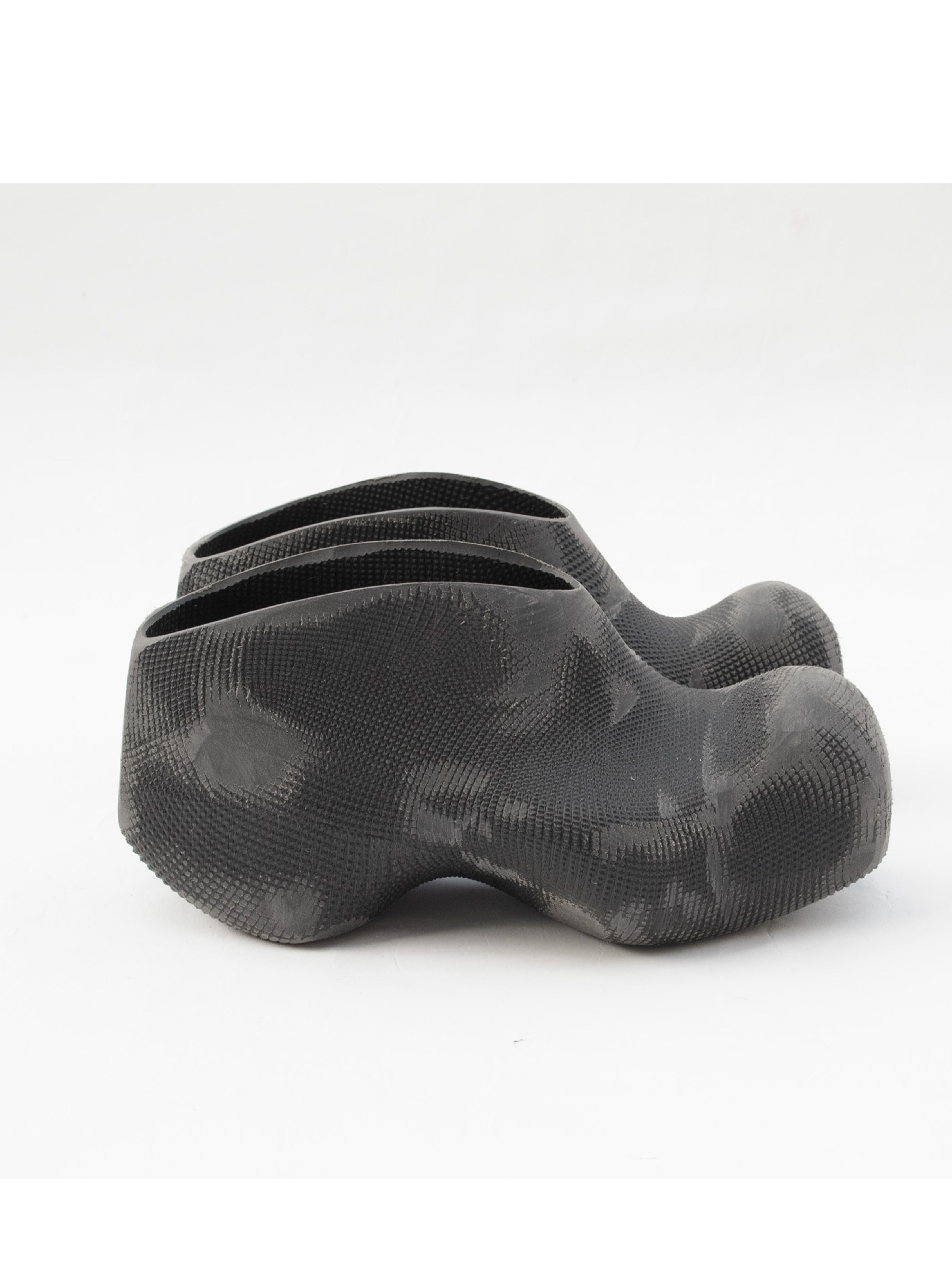 3d-printed heeled rubber mules. These mules are crafted entirely from a fully recyclable, highly flexible polyurethane rubber. They are sanded post-printing to contribute towards a worn-out aesthetic. Compared to traditional injection molding, 3d printing minimizes material waste while maintaining structural integrity. Minor surface imperfections are inherent to the printing process and contribute to the product’s aesthetic without affecting functionality.