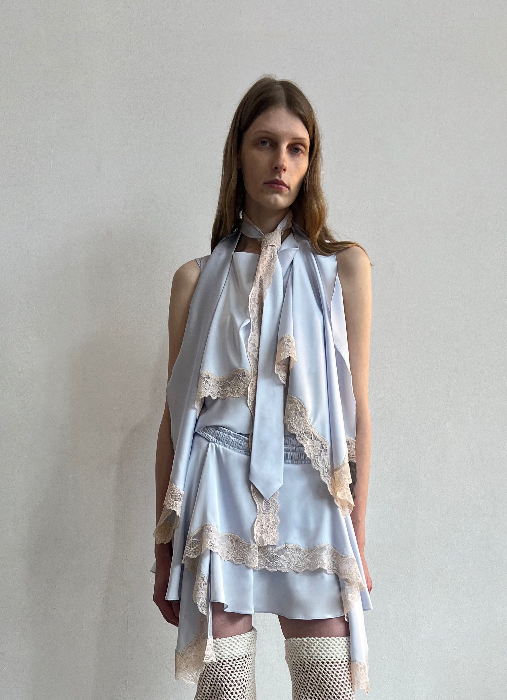 Established in 2020 by twin sisters Anastasia and Maria Vaniushina, Nastyamasha is a fashion label that designs wearable and comfortable garments that allow for easy movement. The brand incorporates mesh fabrics and crocheted knitwear to give a fresh interpretation to conventional restrictive clothing, featuring structured corsets, textured miniskirts, and strapless tops.