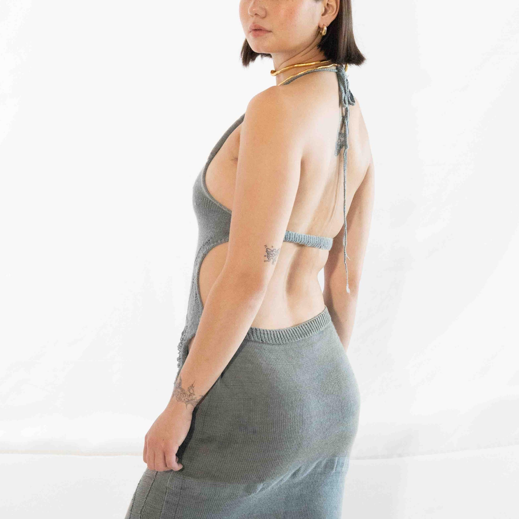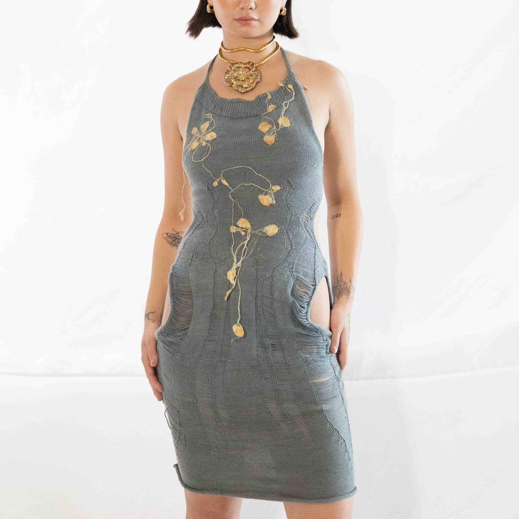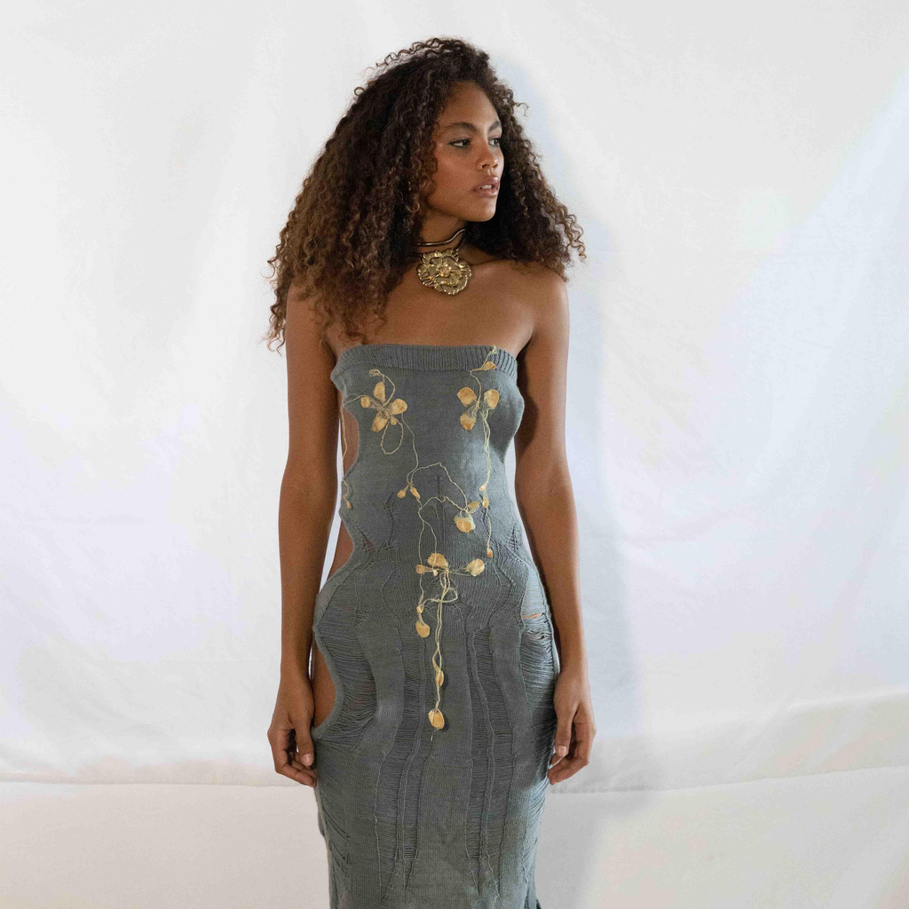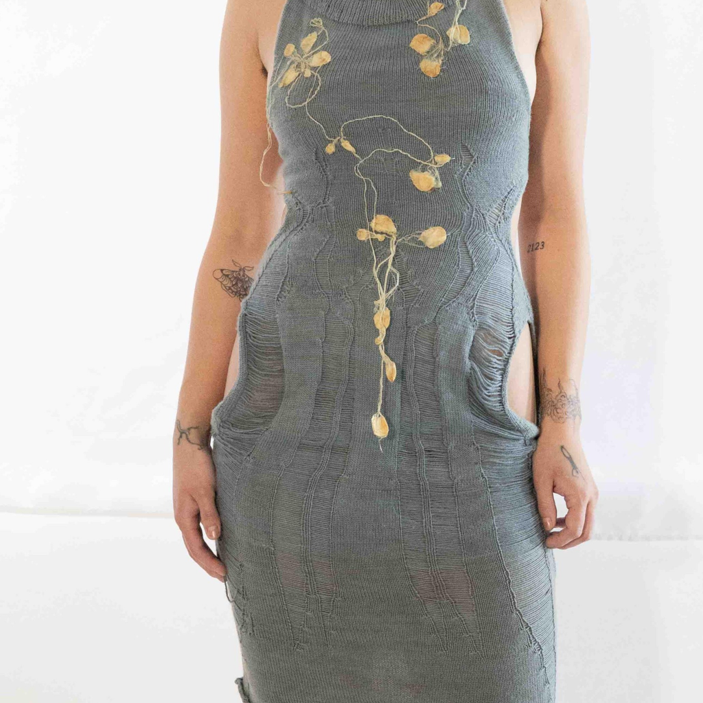 This Saturday Indigo Silk Cocoon Dress is knit with two skeins of handspun cotton yarn sourced in NYC. Naturally dyed with Japanese indigo and finished with hand-pulled silk cocoons dyed and raised from the egg by GRACE GUI Studio in Brooklyn.