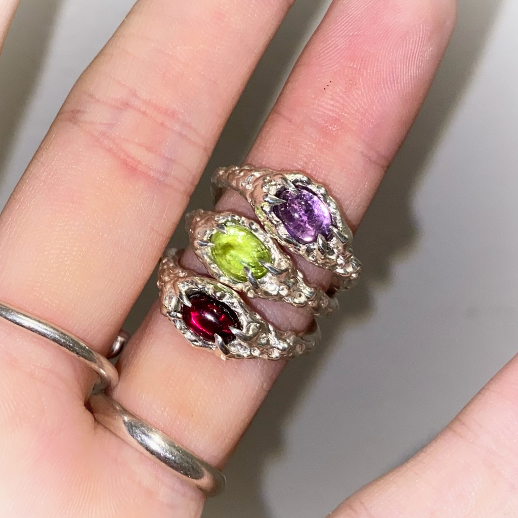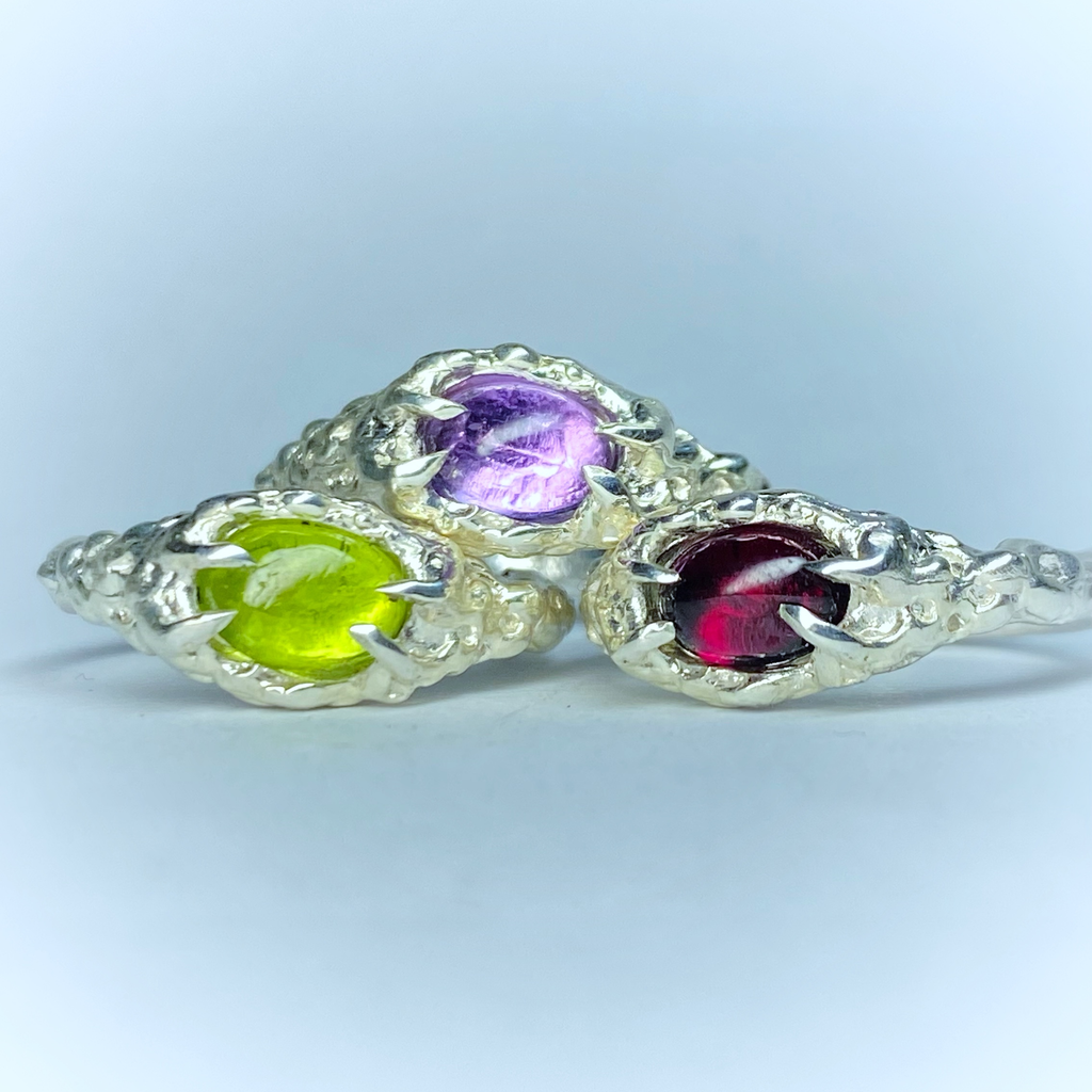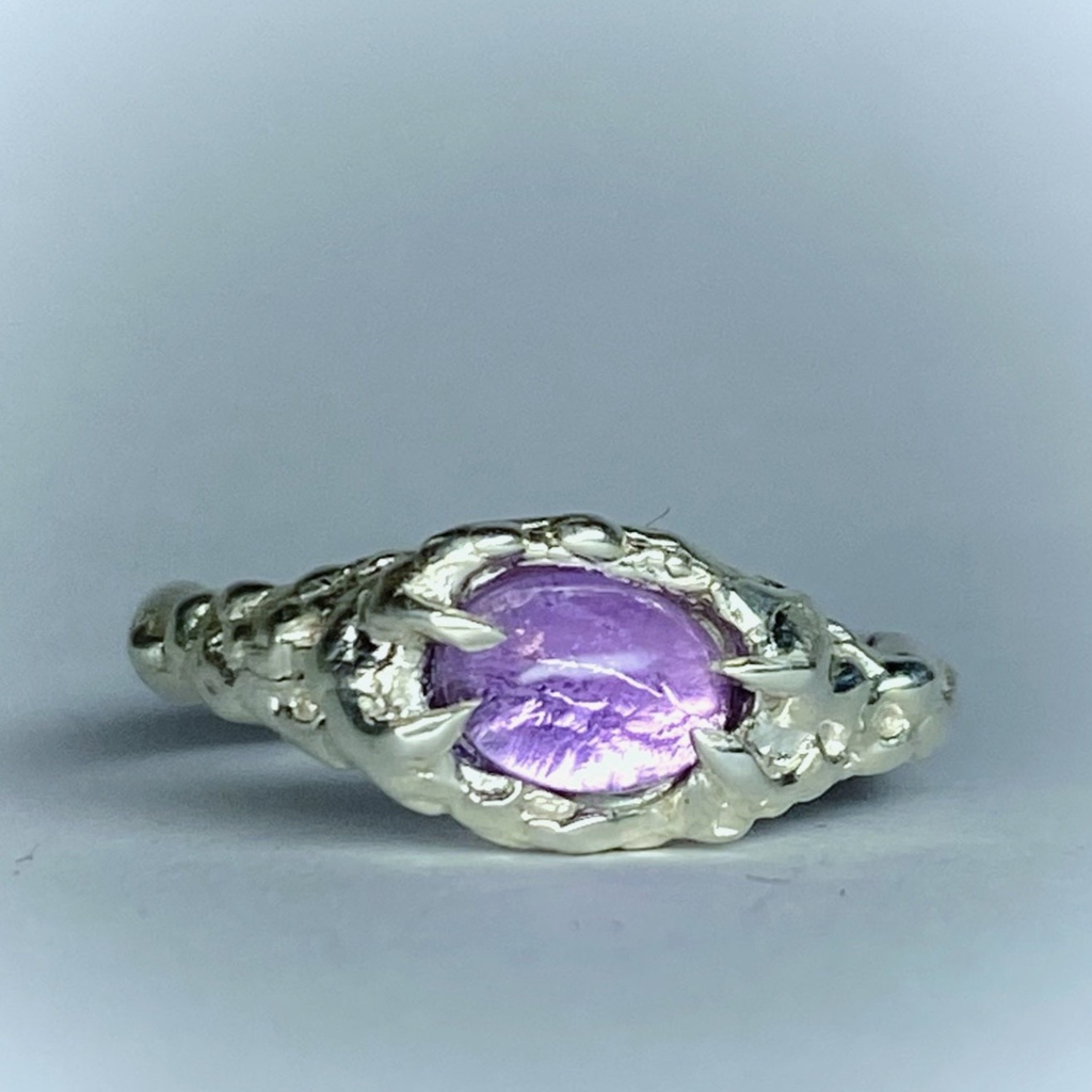 Recycled sterling silver ring with a claw set rhodolite garnet cabochon in a textured band.