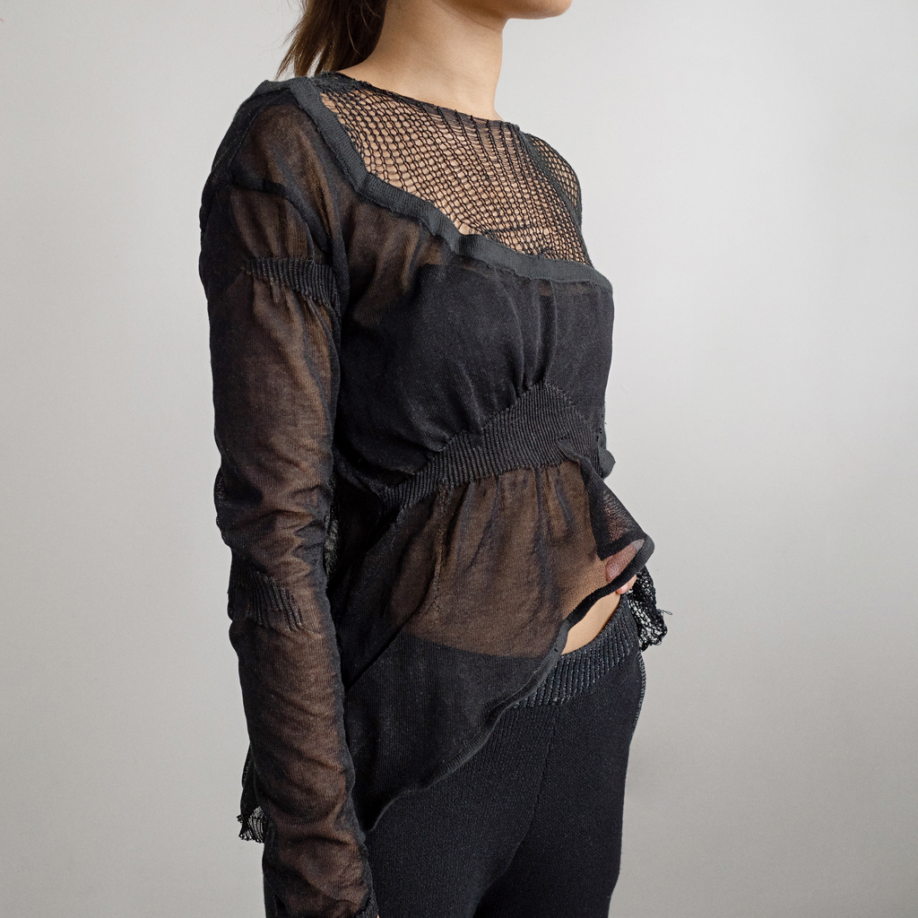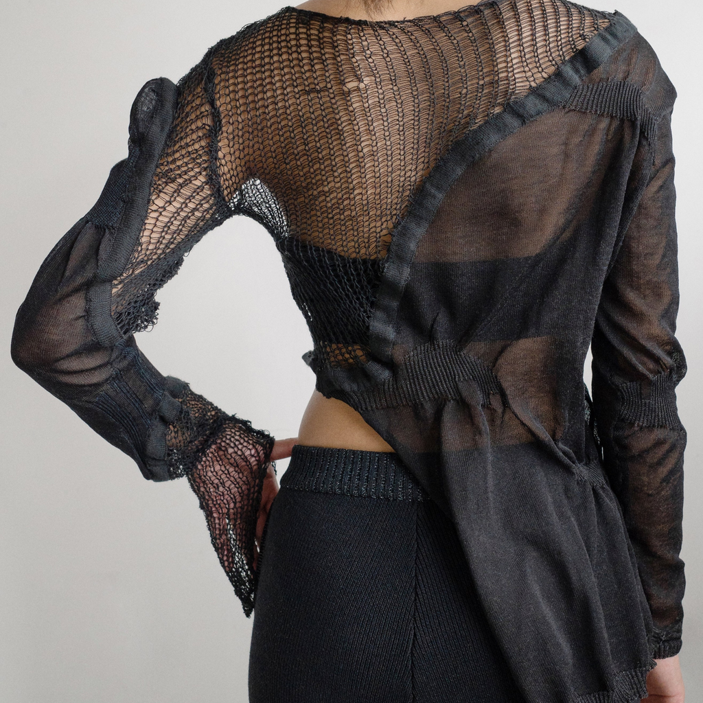 Scar top linked with mesh knit panels by Khanh Brice Nguyen.