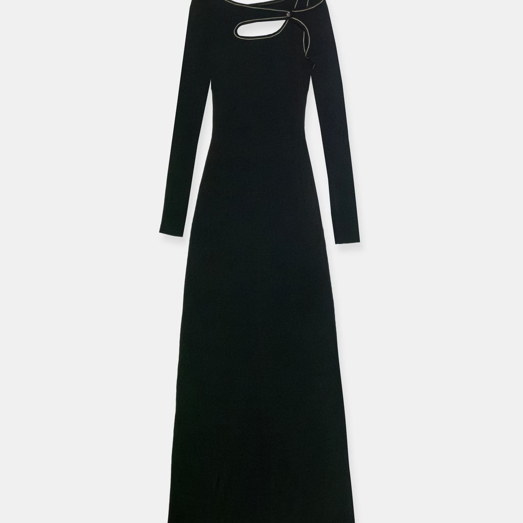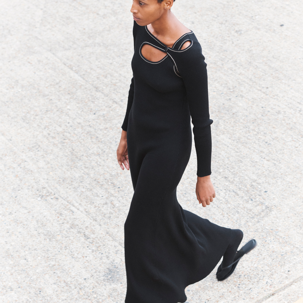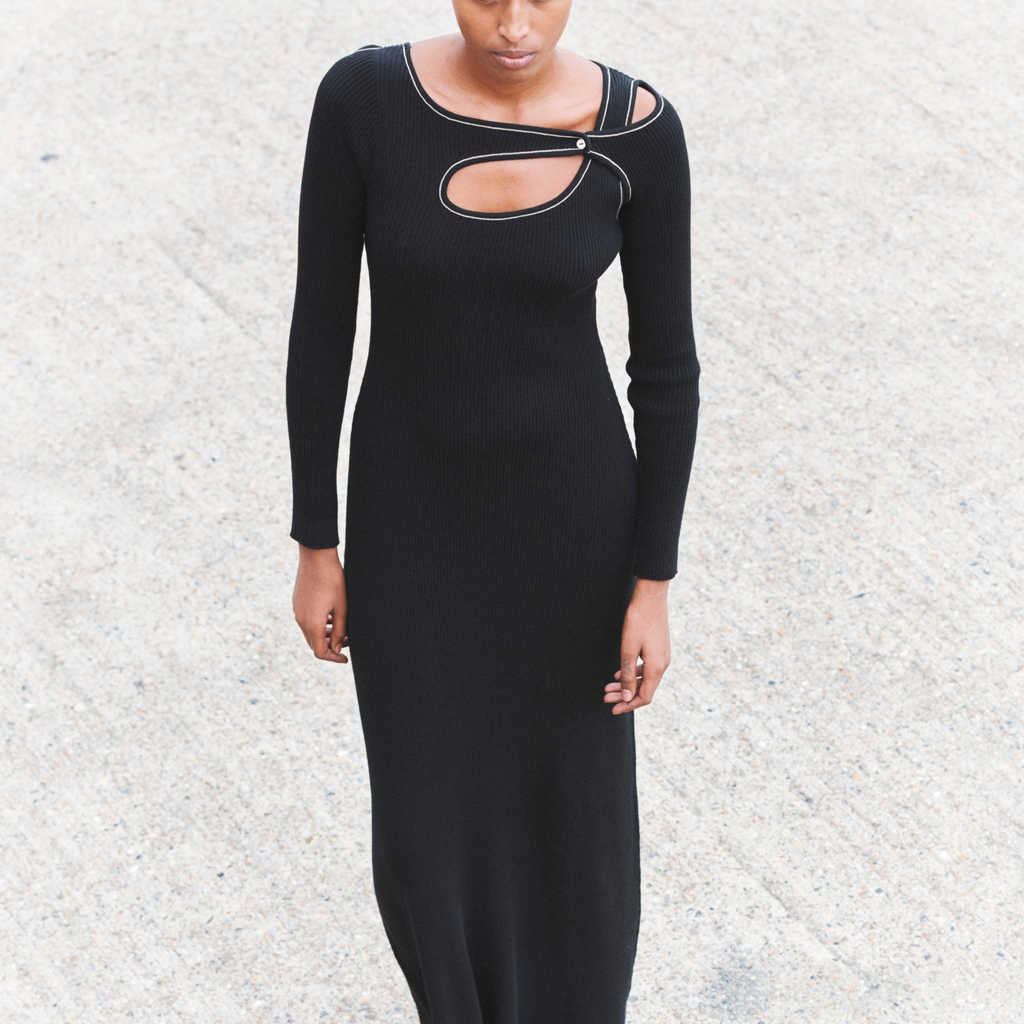 Maxi length knit dress knitted from GOTS certified organic cotton. Neckline with cutout detail and contrast link-stitched edge trim.