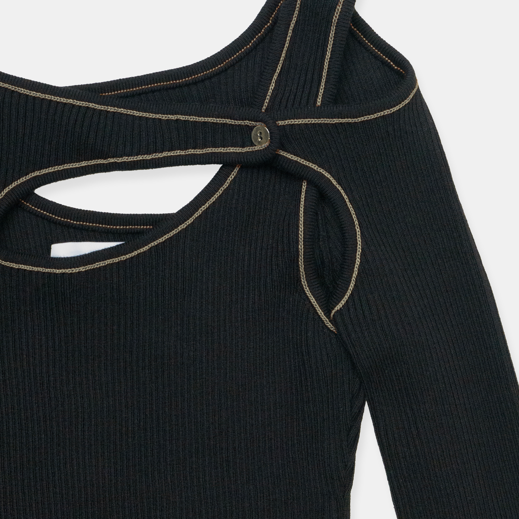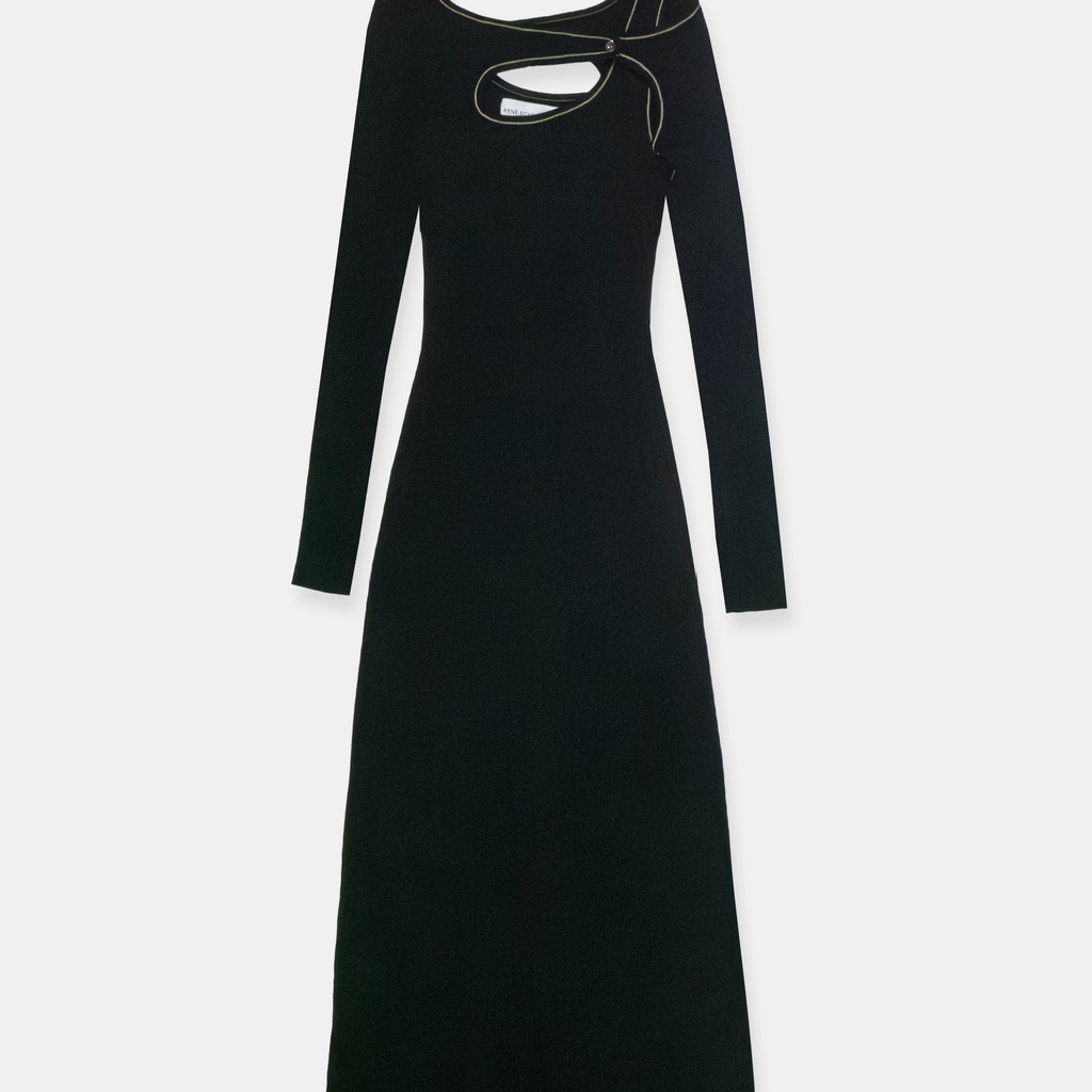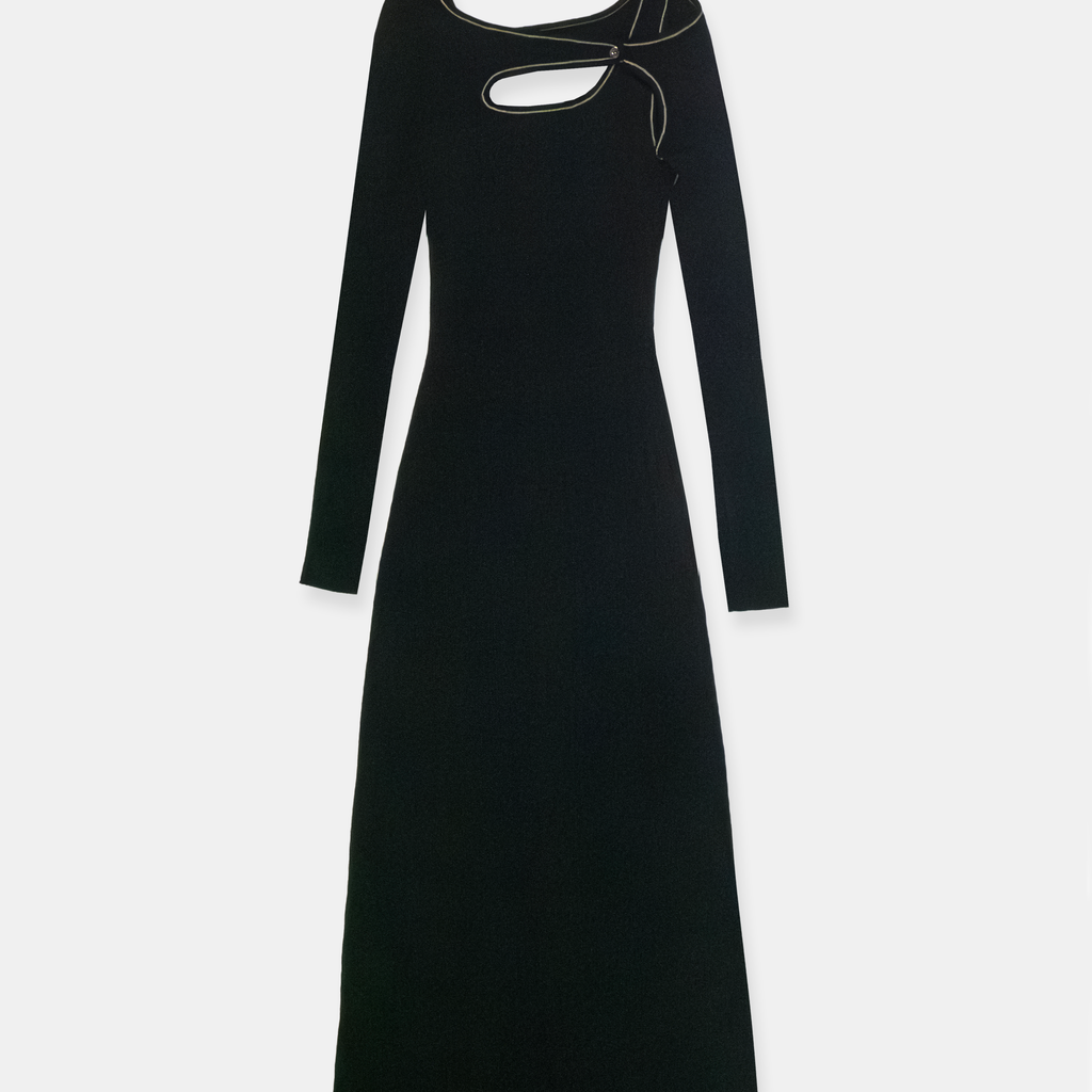 Midi length knit dress knitted from GOTS certified organic cotton. Neckline with cutout detail and contrast link-stitched edge trim.