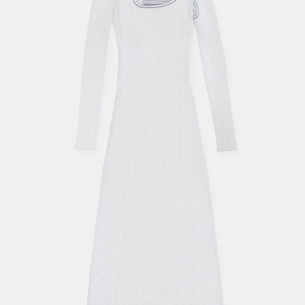 Midi length knit dress knitted from GOTS certified organic cotton. Neckline with cutout detail and contrast link-stitched edge trim.
