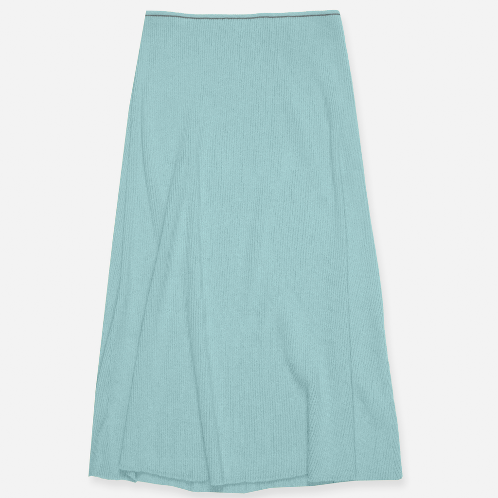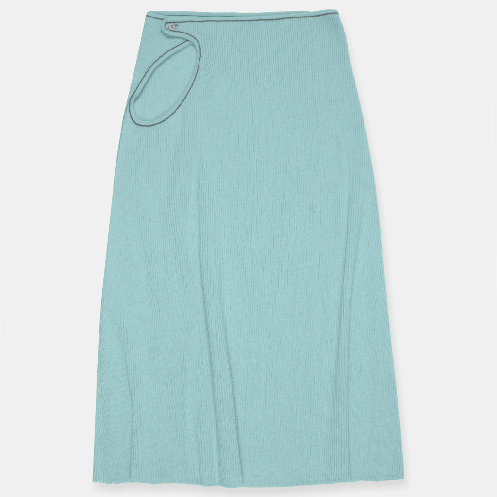 Midi knit skirt made from GOTS certified organic cotton featuring cutout detail on right side with contrast link-stitched edge trim and button closure.