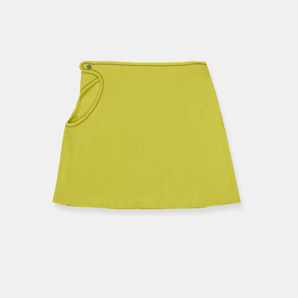 Midi knit skirt made from GOTS certified organic cotton featuring cutout detail on right side with contrast link-stitched edge trim and button closure.