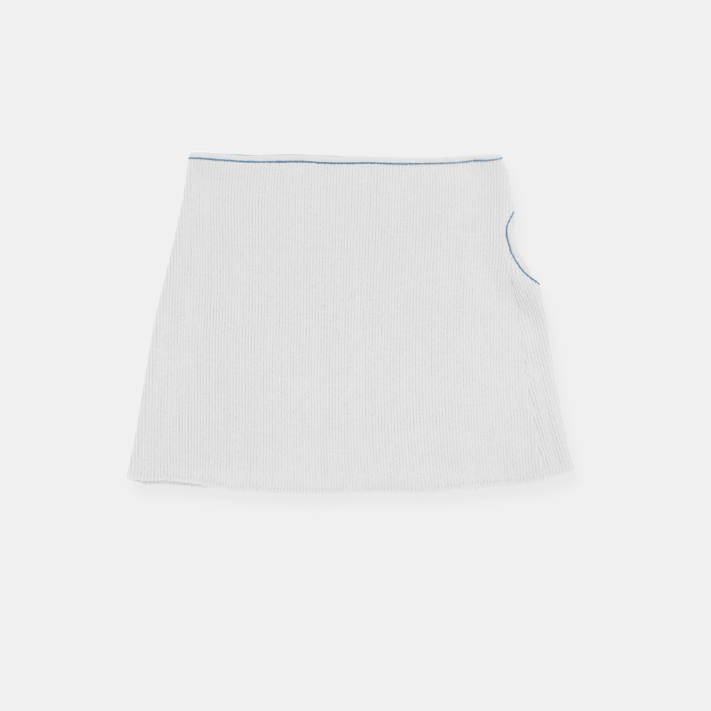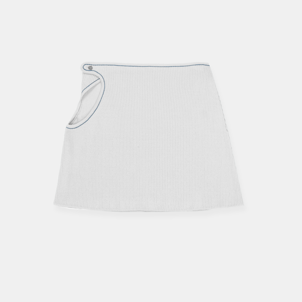 Midi knit skirt made from GOTS certified organic cotton featuring cutout detail on right side with contrast link-stitched edge trim and button closure.