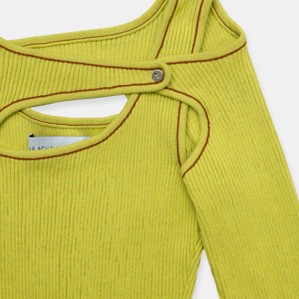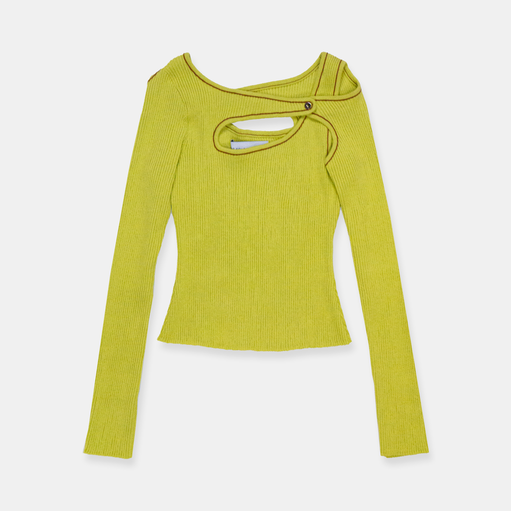 Fully fashioned ribbed knit top made from GOTS certified organic cotton with contrast trim linking detail.