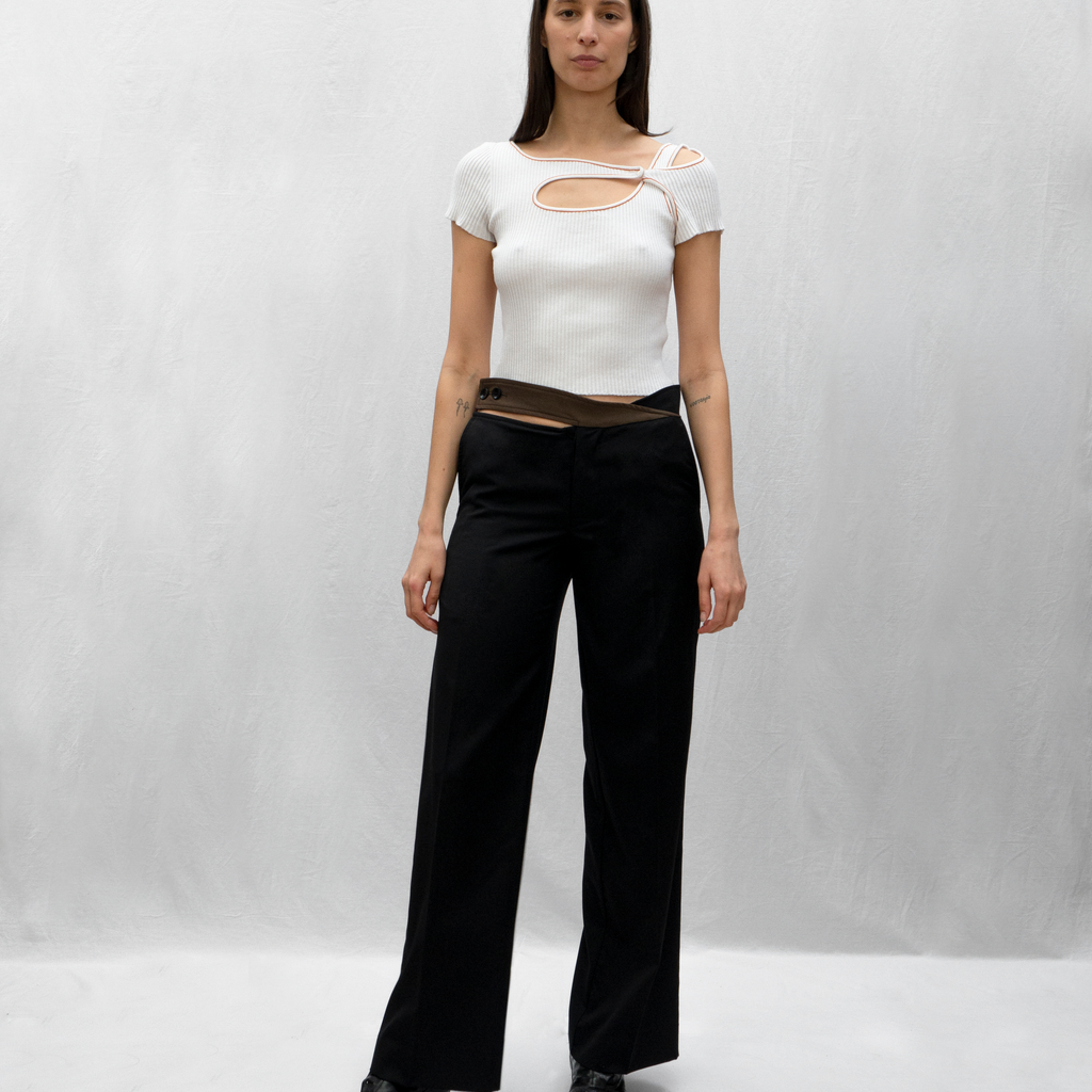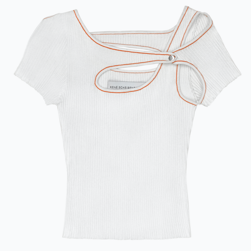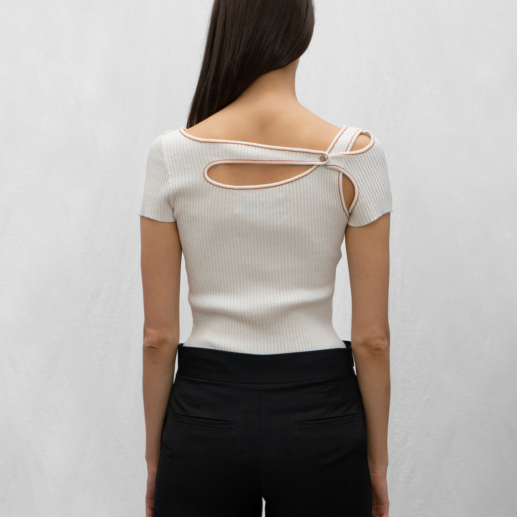 Fully fashioned ribbed knit top made from GOTS certified organic cotton with contrast trim linking detail.