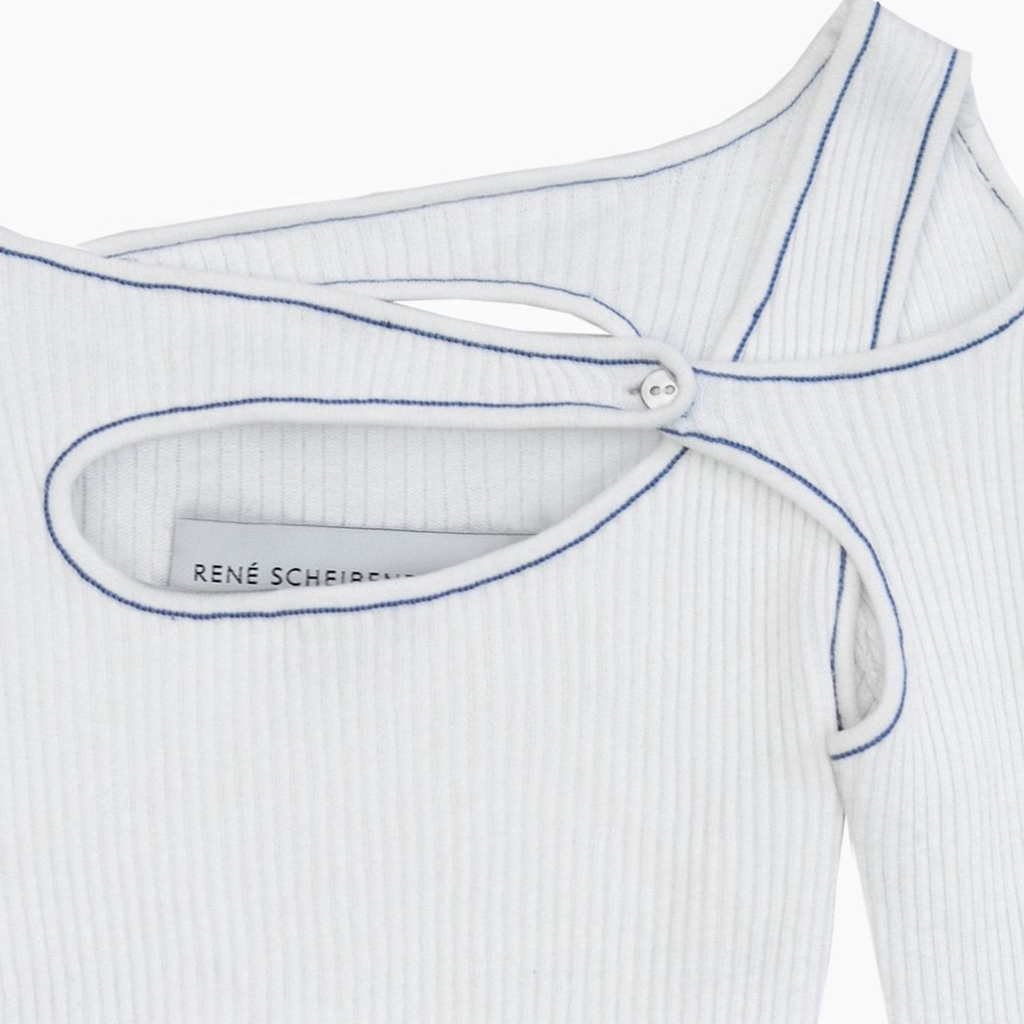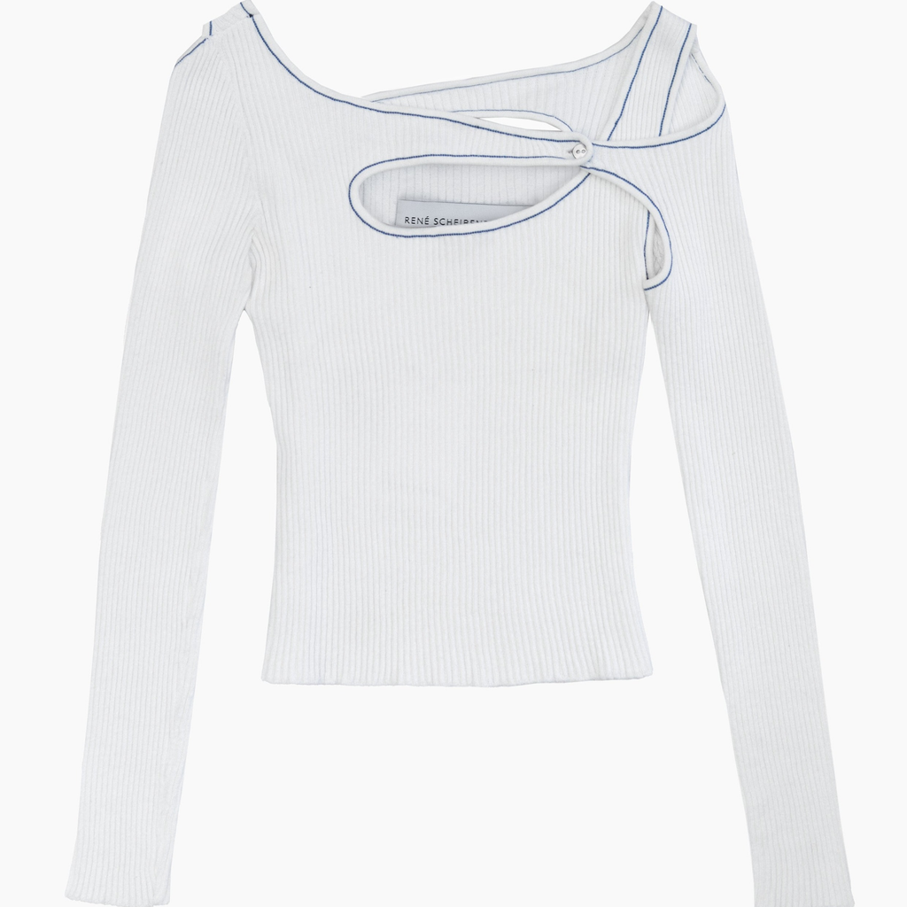 Fully fashioned ribbed knit top made from GOTS certified organic cotton with contrast trim linking detail.