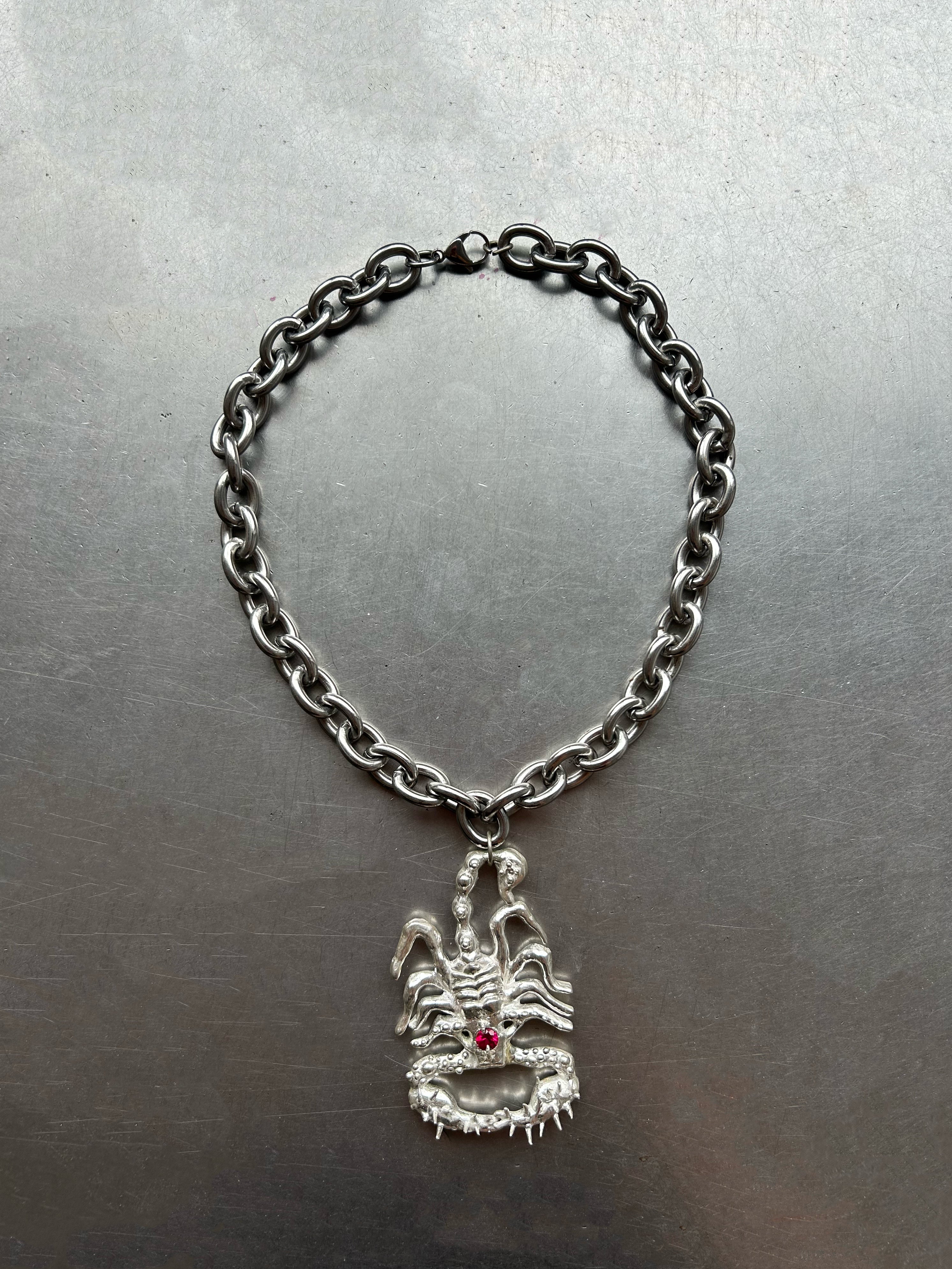 Hand-carved scorpion in wax, cast in bronze and silver-plated. It features a small ruby at its center and comes with a thick stainless steel chain.