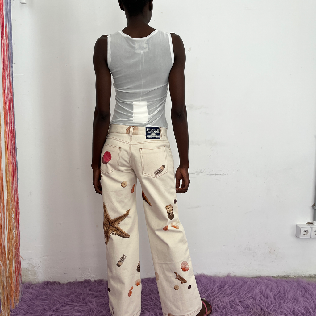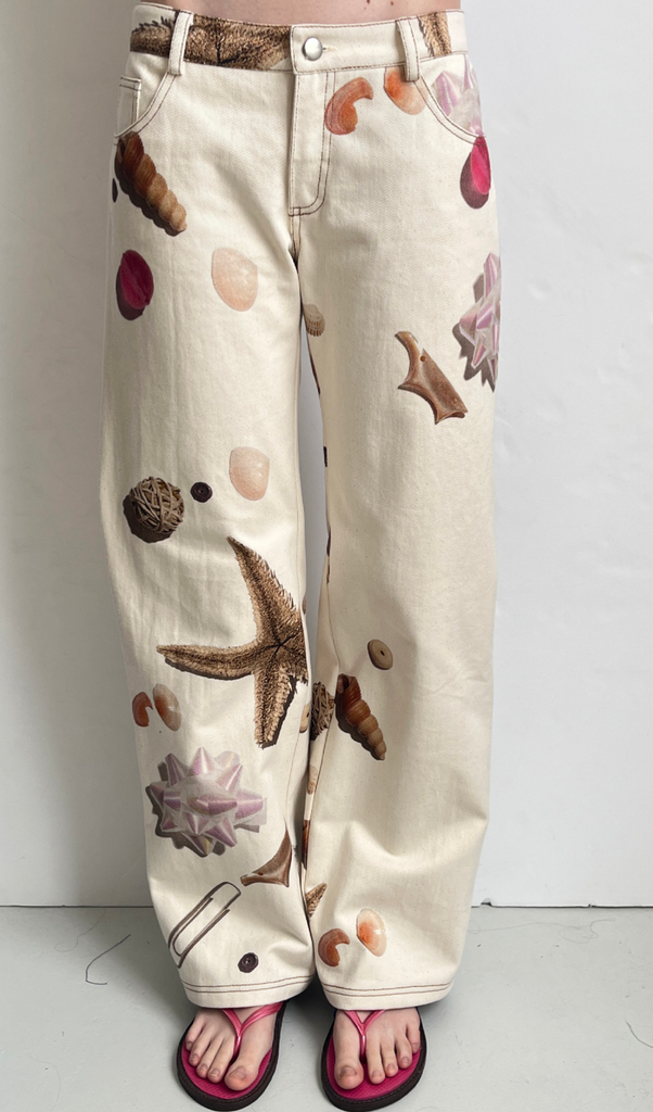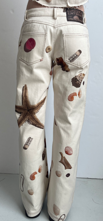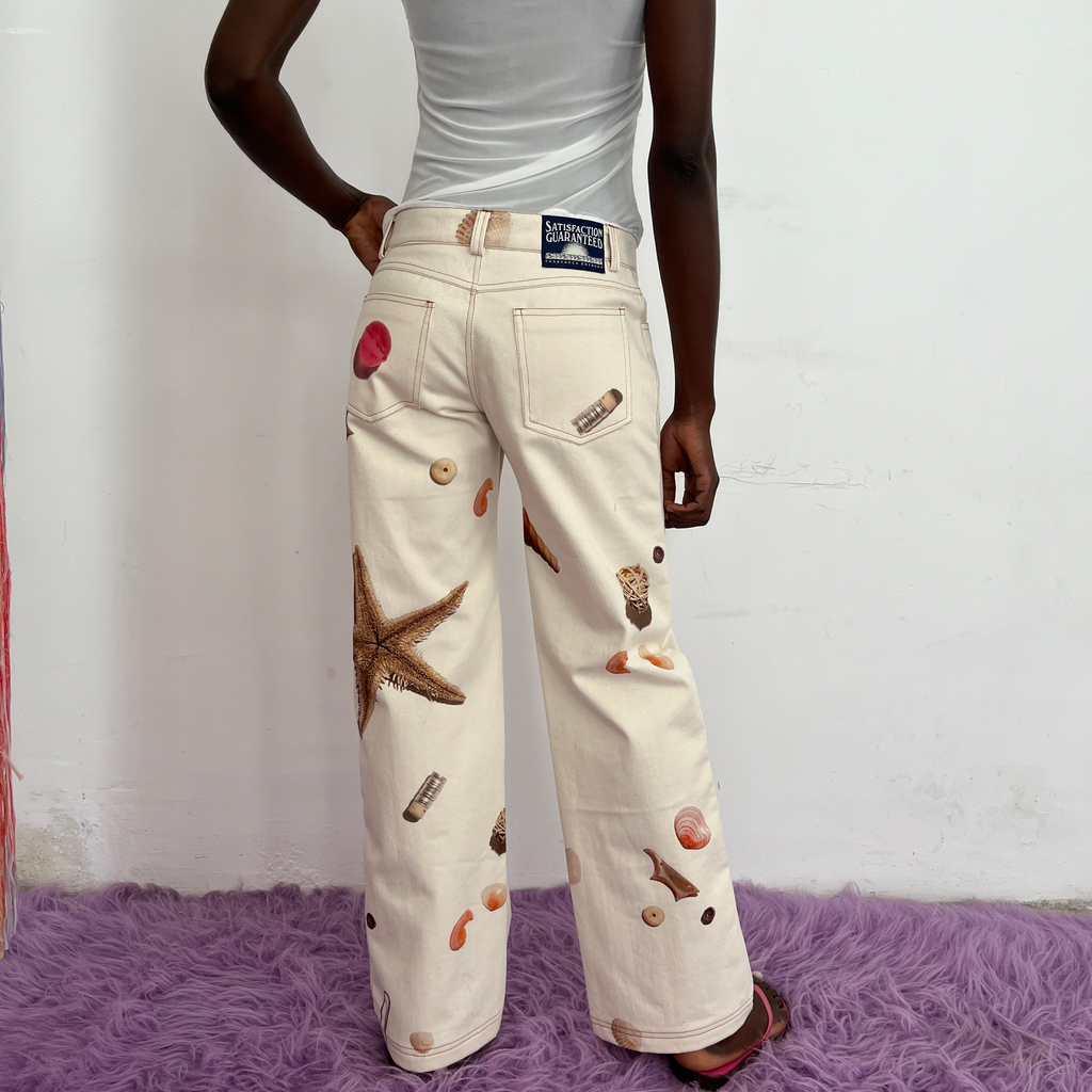 Five-pocket design, washed wide-leg jeans with seastar print. Made from cotton denim.