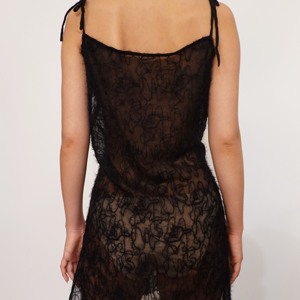 Slip dress with knit threads embroidered on silk base. Made with 85% Silk, 15% Polyamide