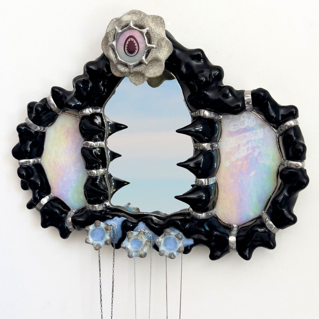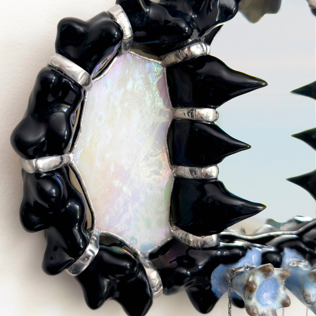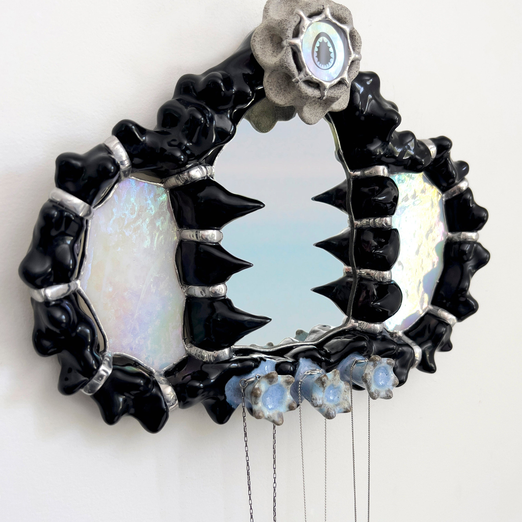 Hand-sculpted ceramic wall mirror designed to hang jewelry or other small items. Created using reclaimed mirror with iridescent glass details. Each piece is made-to-order, ensuring no two are exactly alike- subtle variations in form, finish and glass textures may occur.