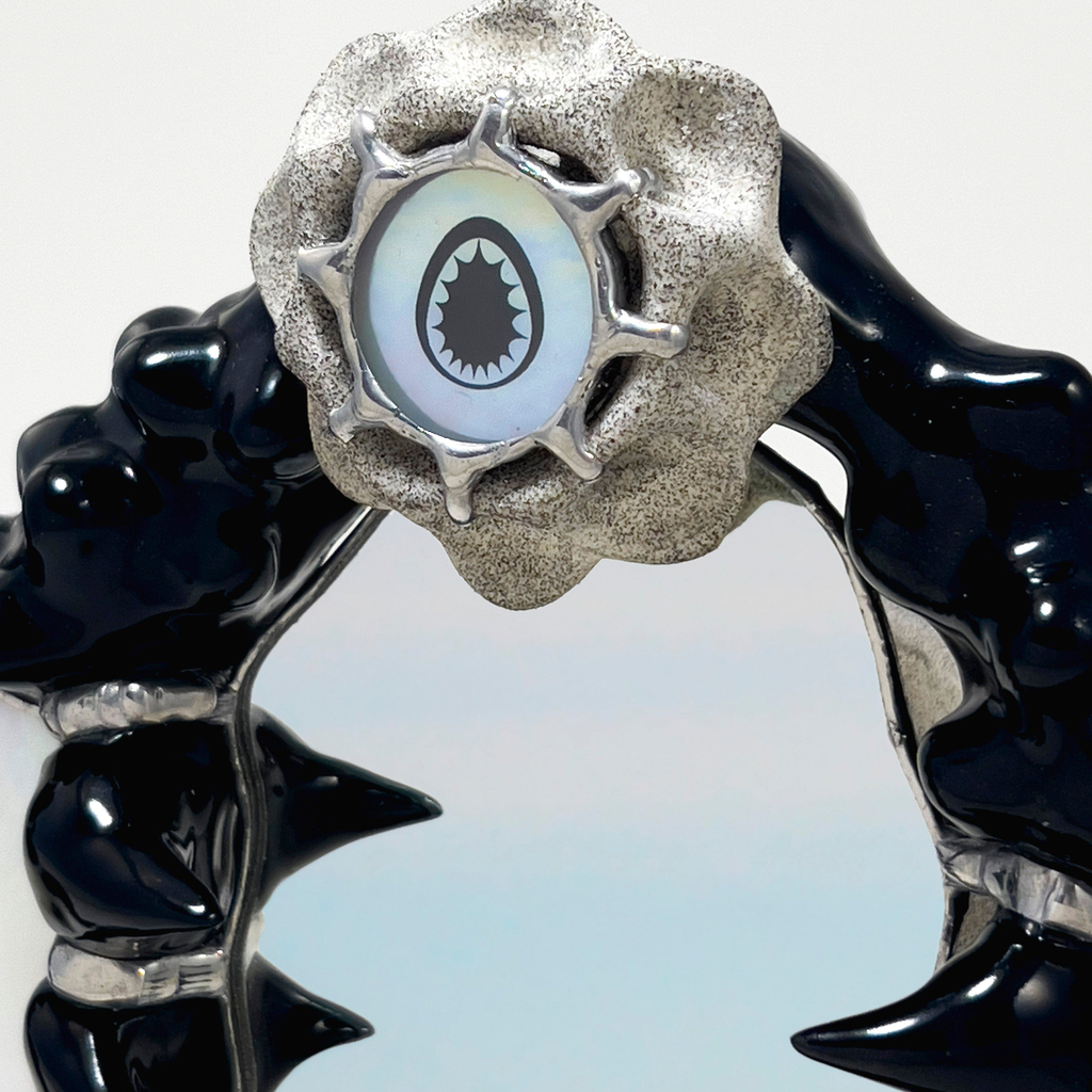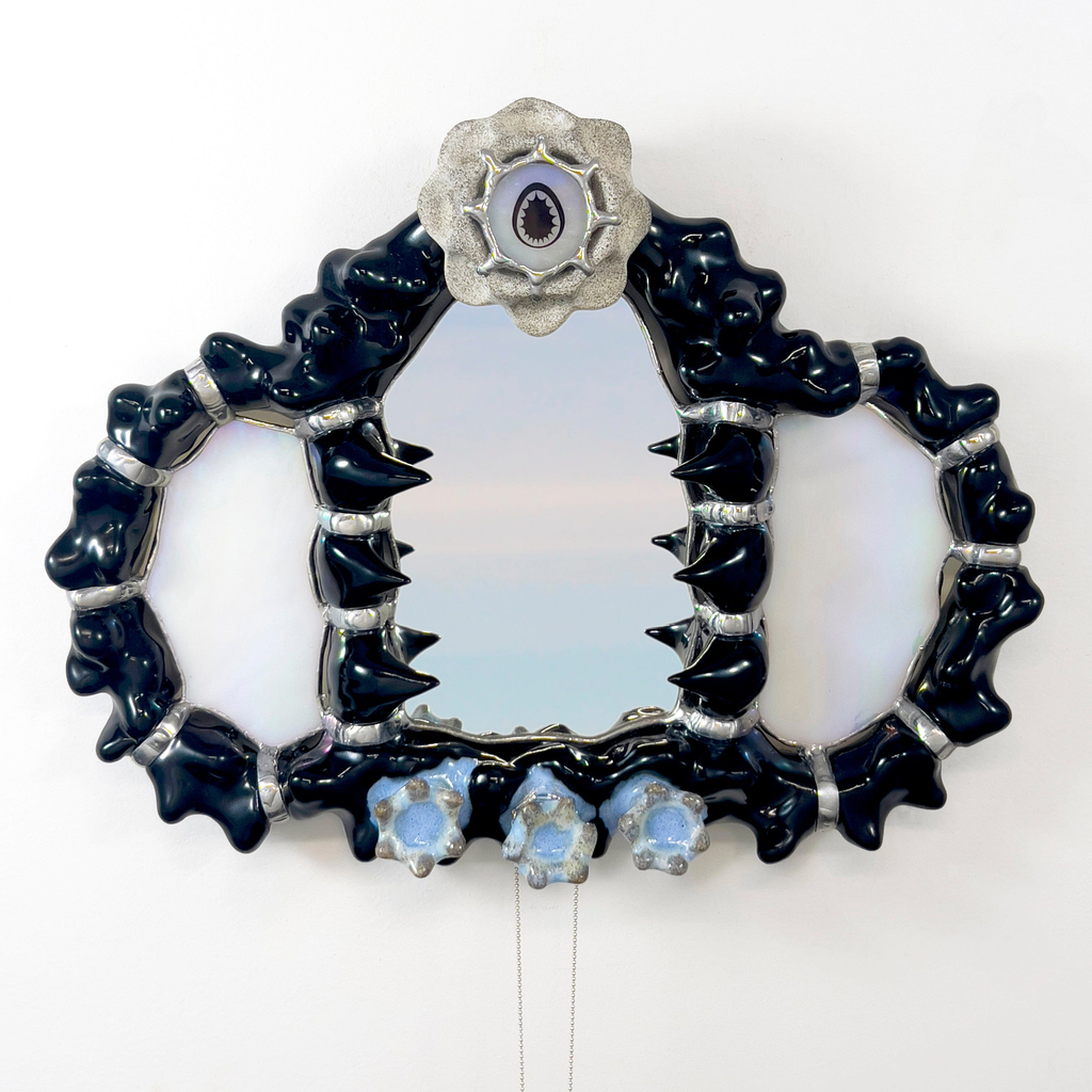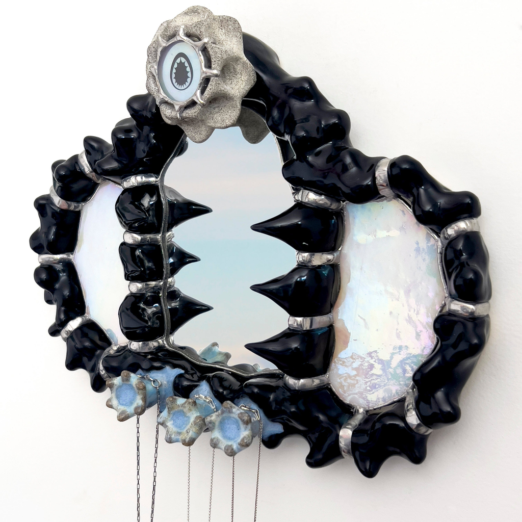 Hand-sculpted ceramic wall mirror designed to hang jewelry or other small items. Created using reclaimed mirror with iridescent glass details. Each piece is made-to-order, ensuring no two are exactly alike- subtle variations in form, finish and glass textures may occur.