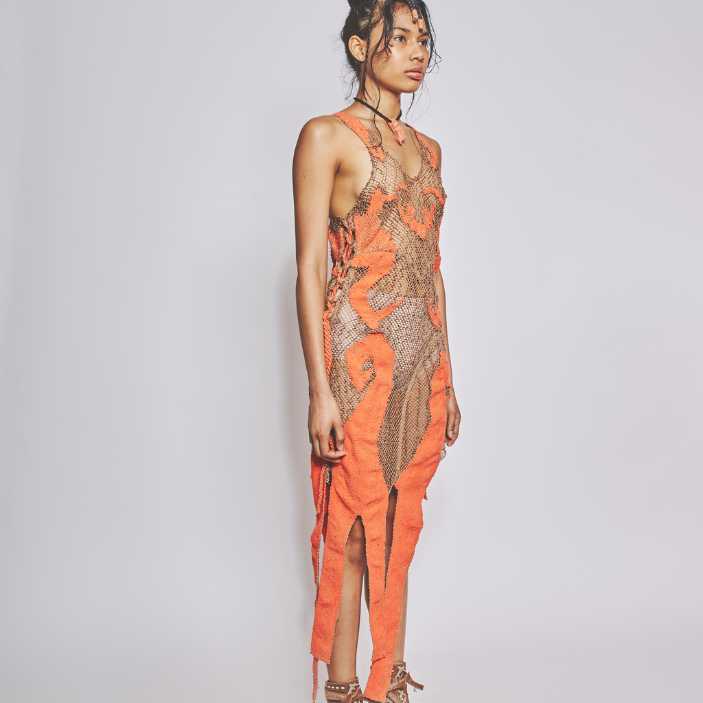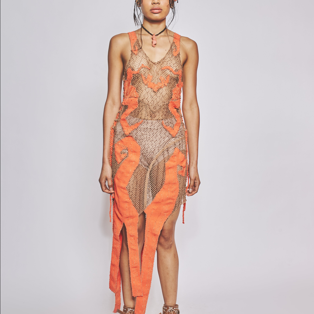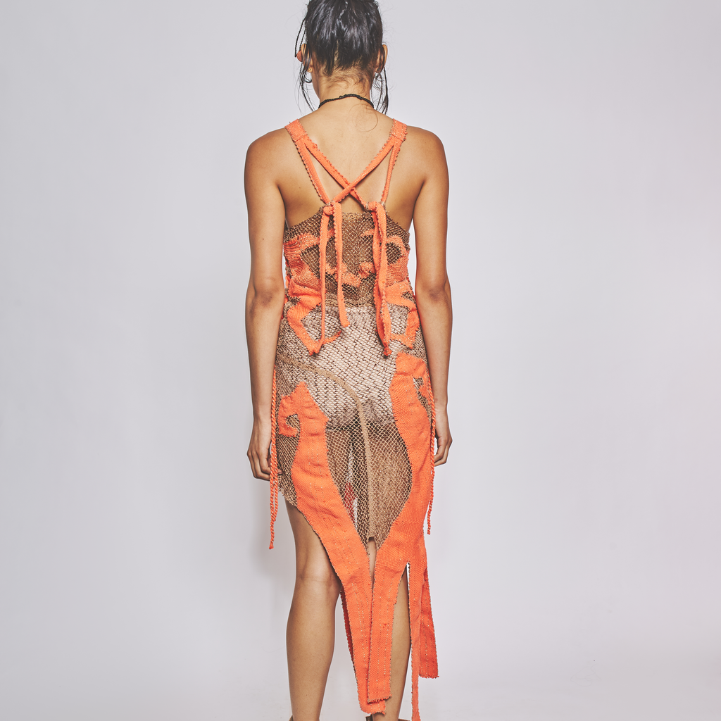 Handmade bobbin lace dress in bamboo, lurex and cotton stretch fibre. Produced with lacemaker artisans in northern Brazil.