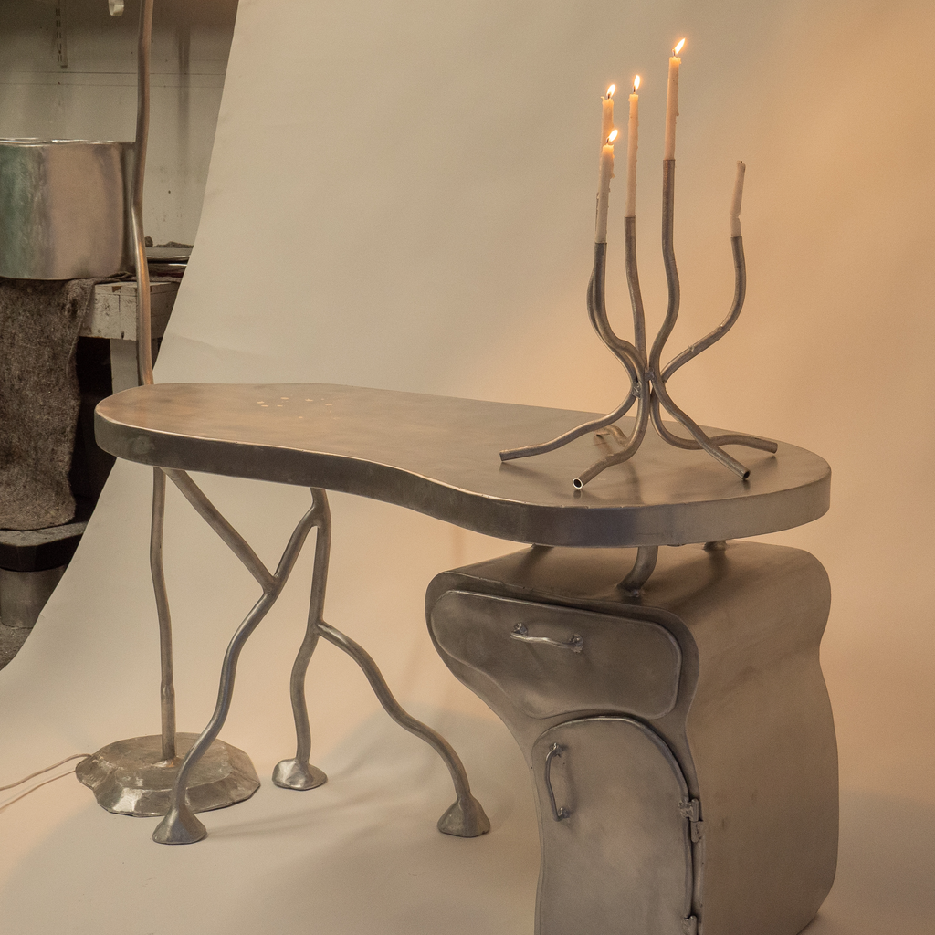 A truly unique piece this desk is a sculptural piece of furniture designed and made by Joe Ellwood and his small team in his workshop in North London. In Six Dot’s signature raw aluminium, the piece blends seamlessly into any colour pallet or interior. At each stage of the design there was a commitment to showing the hands of the maker in the piece, each grind mark, scratch and scuff revel a story about the tools and hands that created the piece. Each of these pieces is hand made in our North London Workshop. Each piece will be marked for authenticity. We make these pieces by hand.