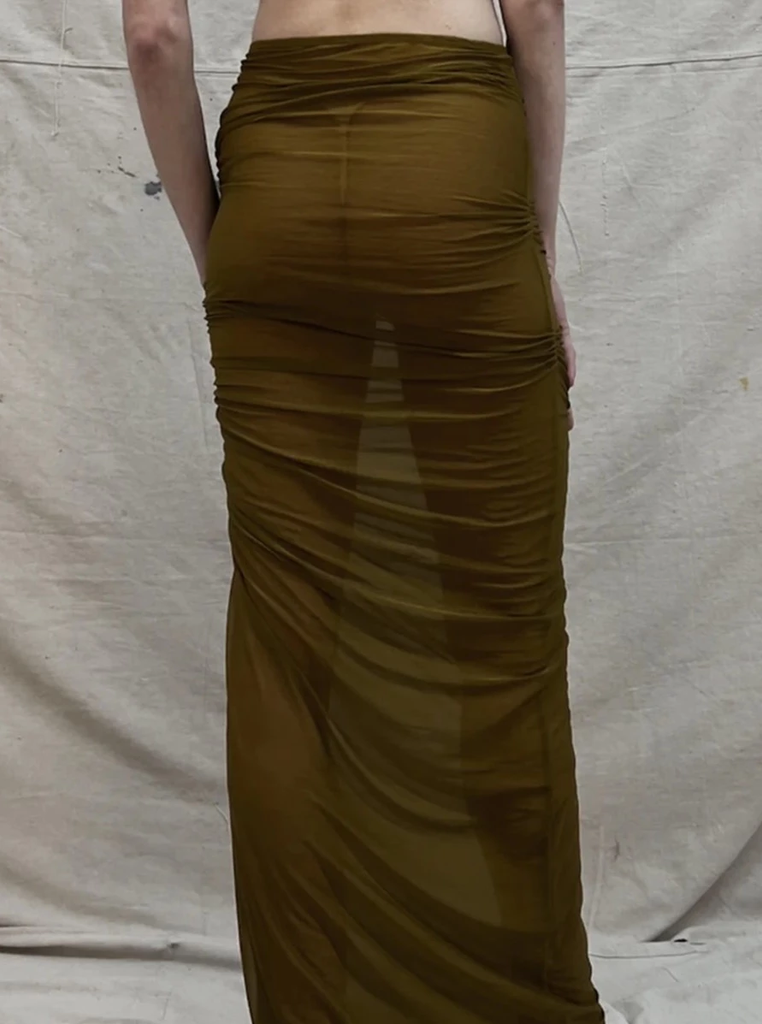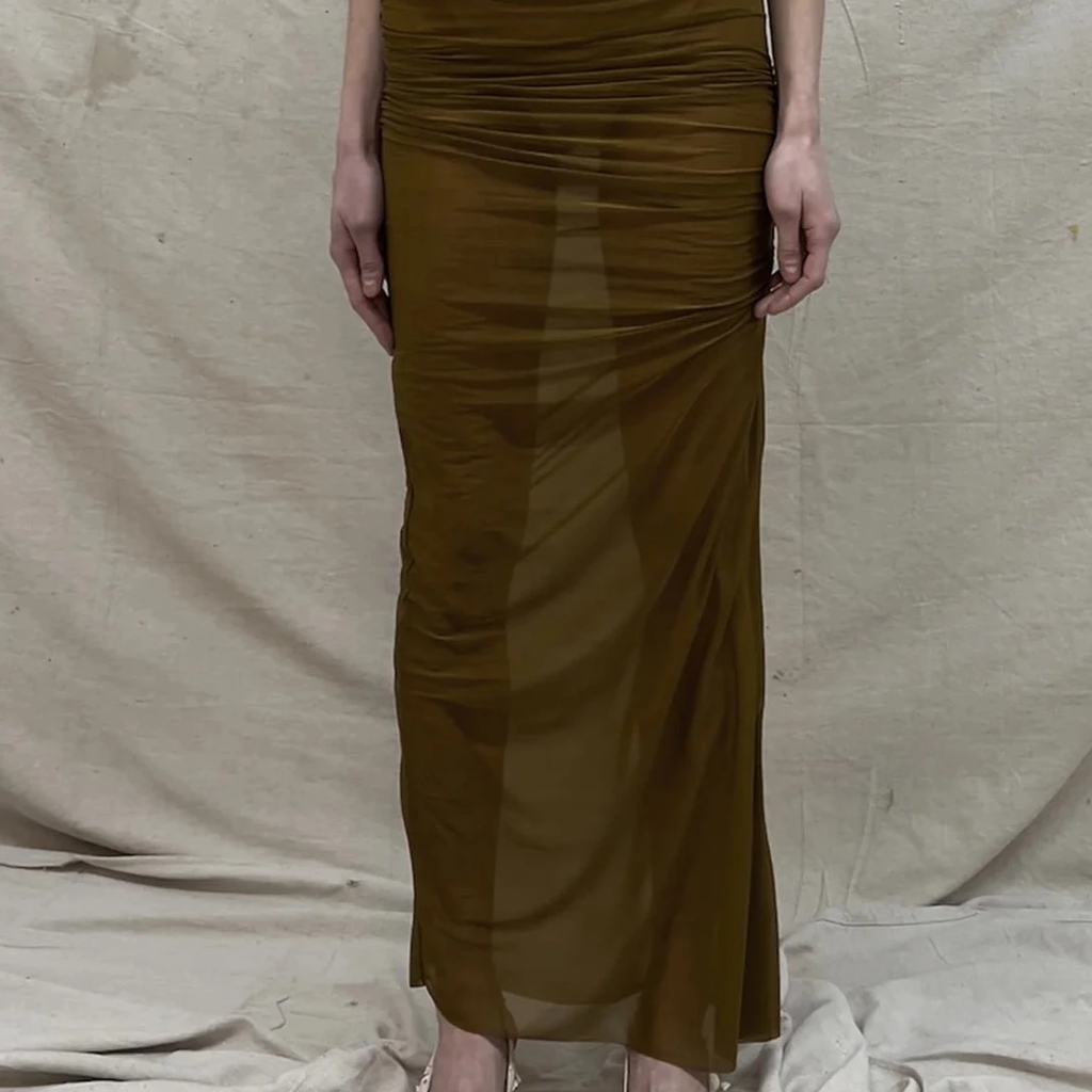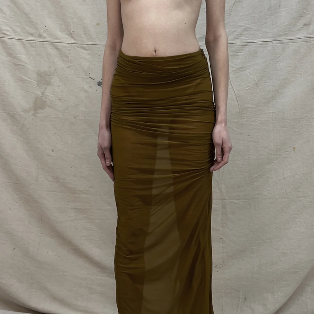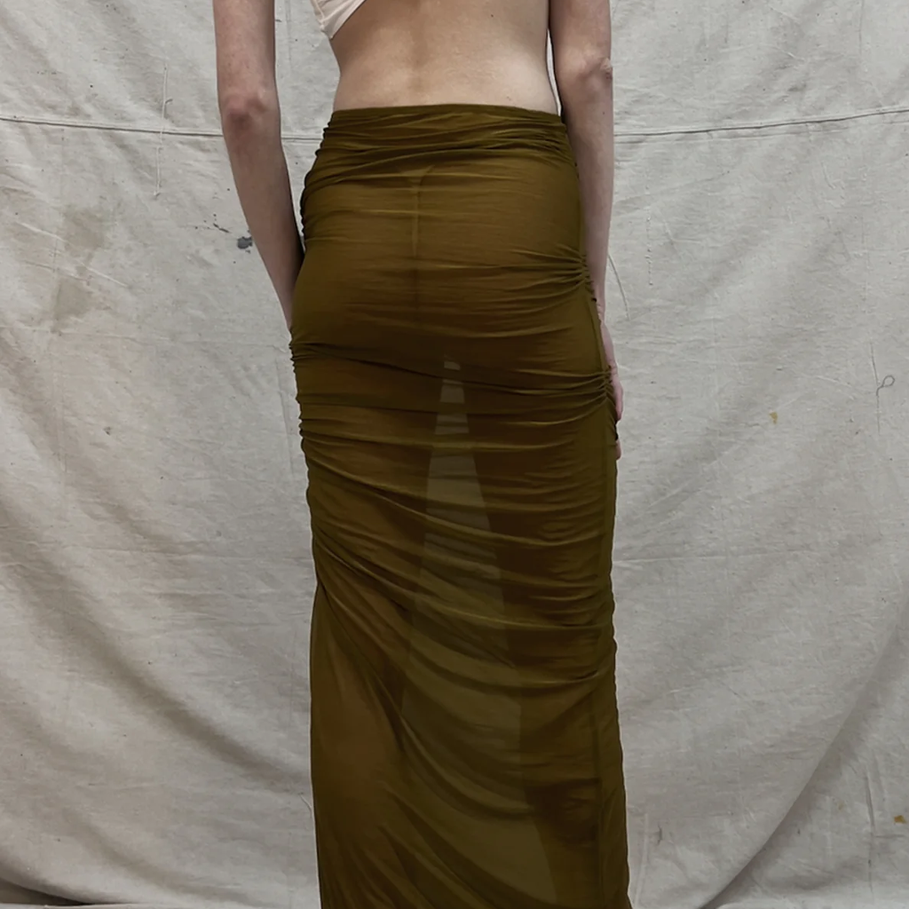 The sheer ruched skirt is a cross-seasonal favorite. Incapable of perfecting the divinity of the female silhouette, we opted for exposure. Cut from a high quality, tight-gauge stretch knit with just the right level of opacity and depth of color which obscures uneven textures in the skin visually while still granting a big reveal.
