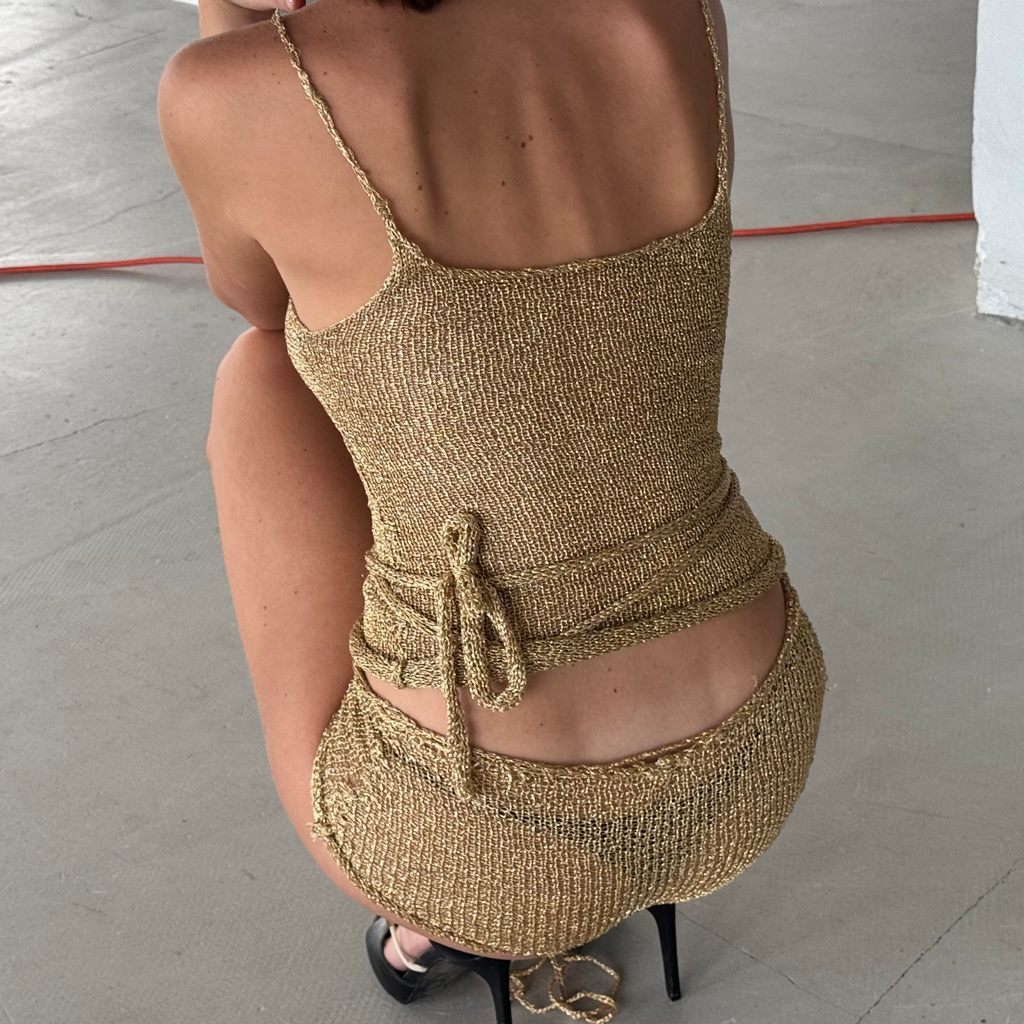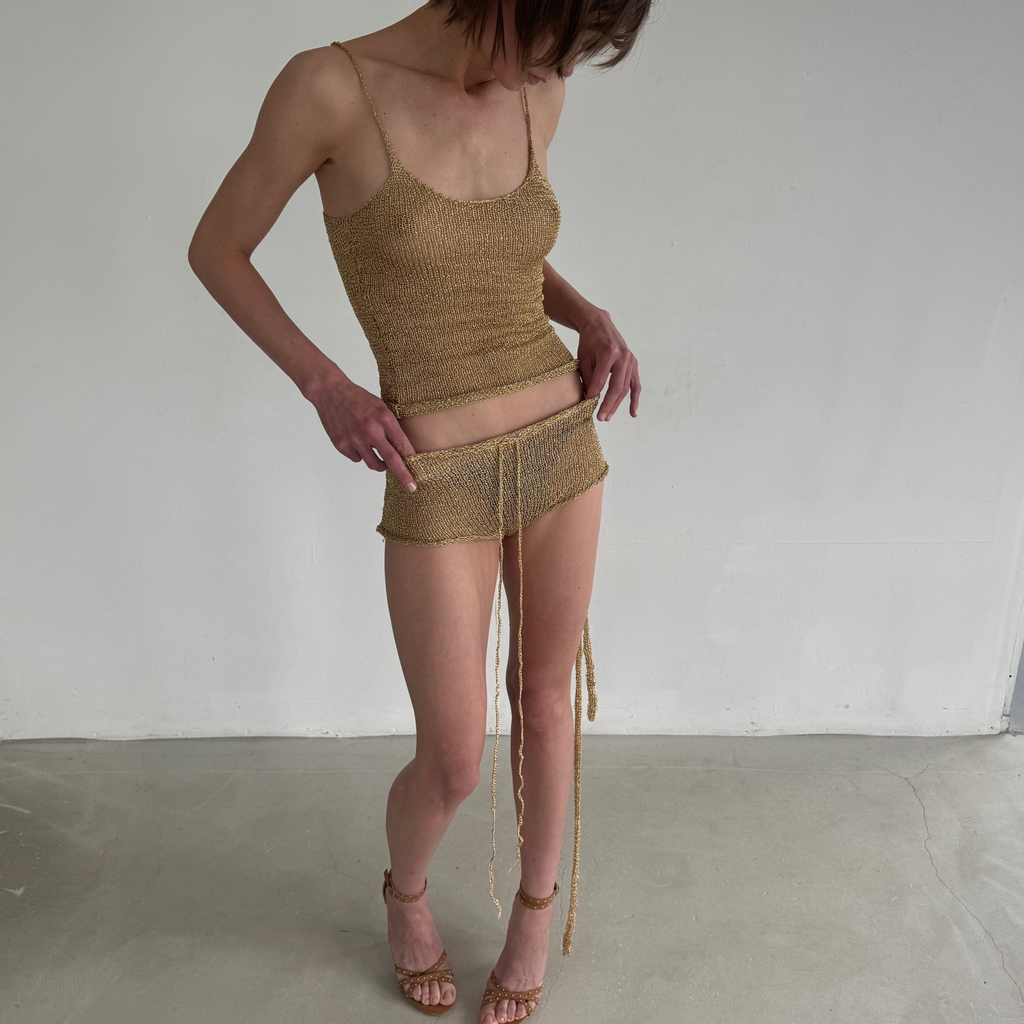 Sparkling knit shorts with extended drawstrings that help secure the shorts at any waist size while adding a unique design element. Perfect for the beach or any occasion you desire