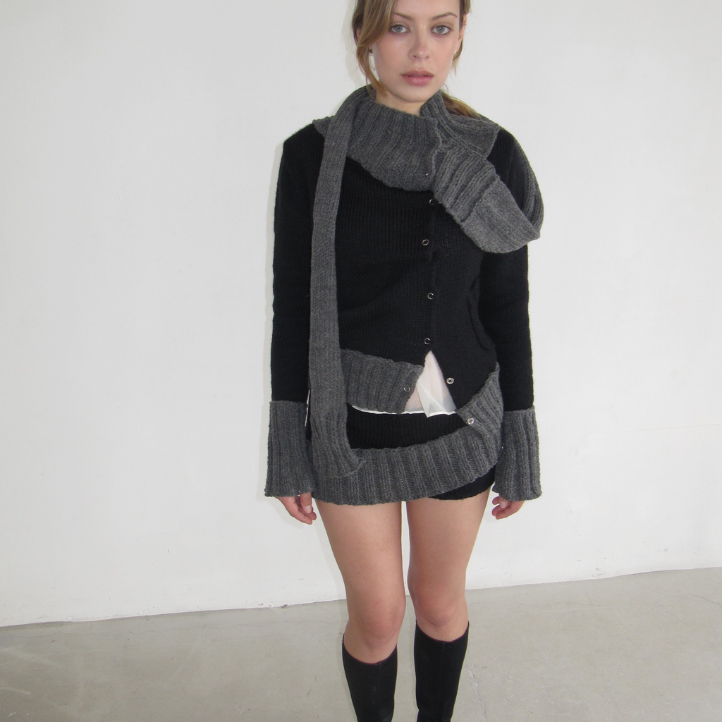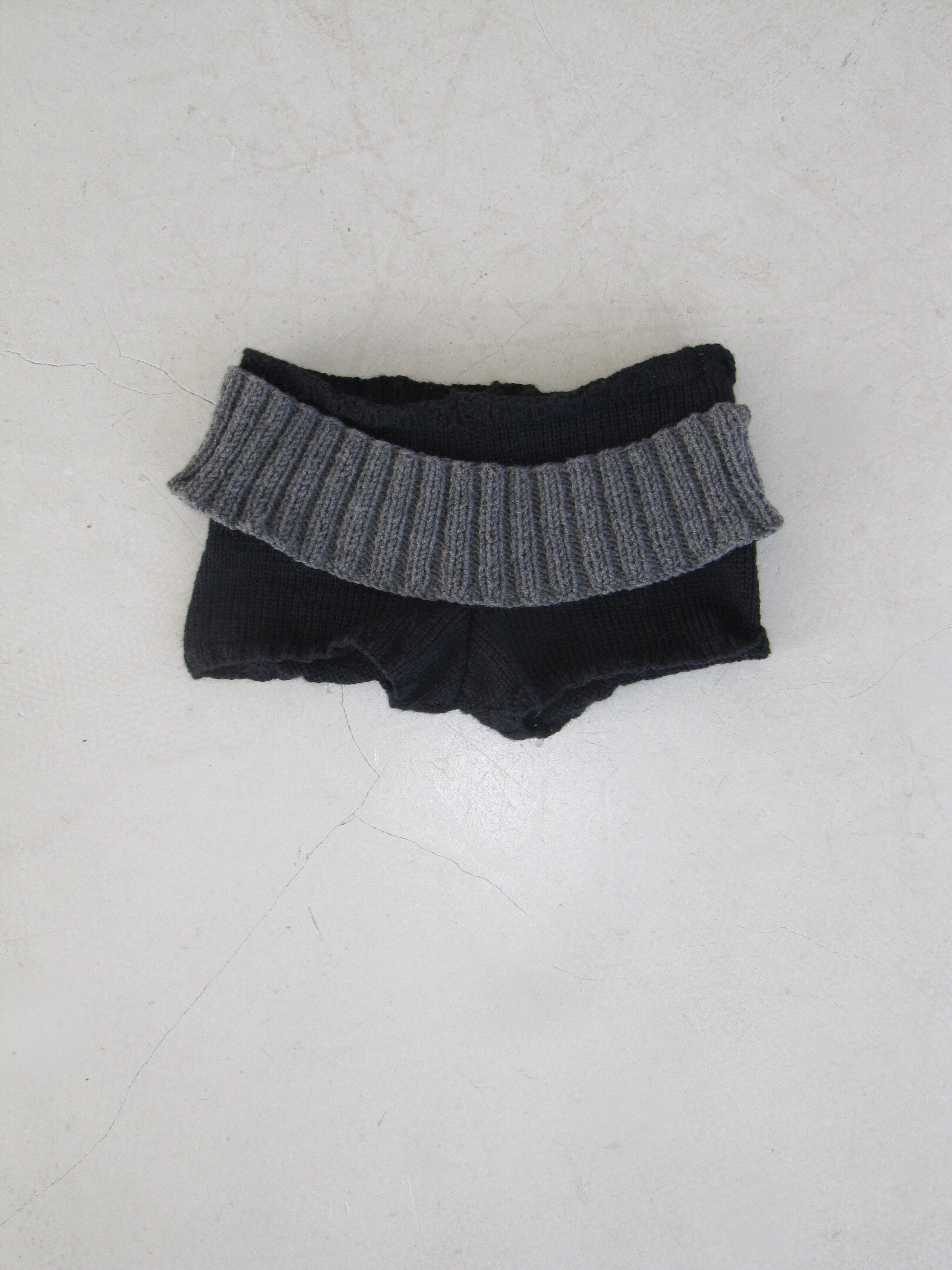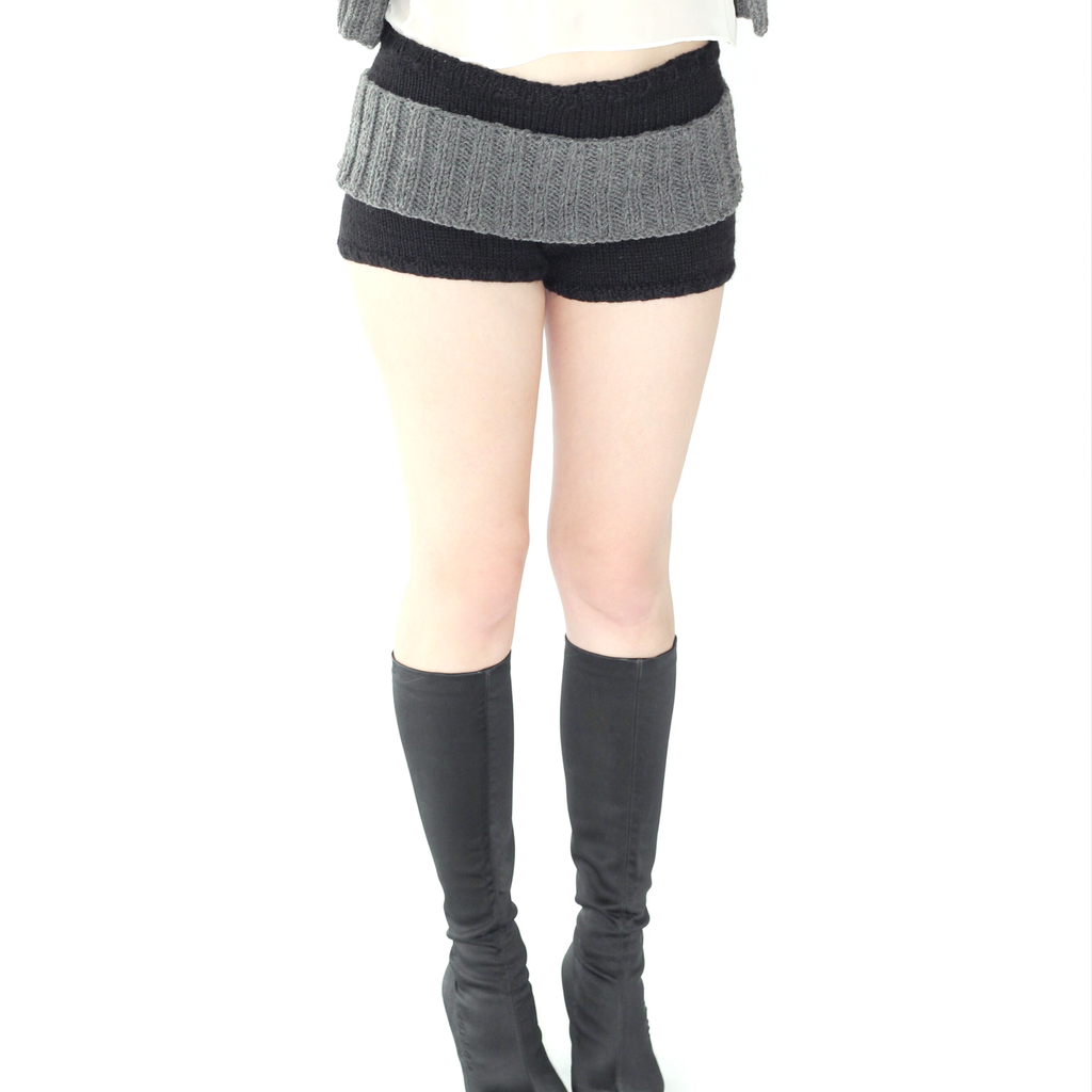 Stretchy black knit shorts featuring a handcrafted grey belt with snap buttons. Includes a removable, flexible detail that can be styled in various ways