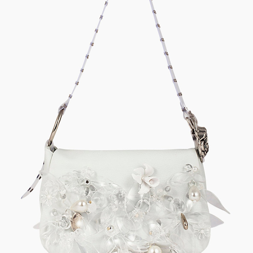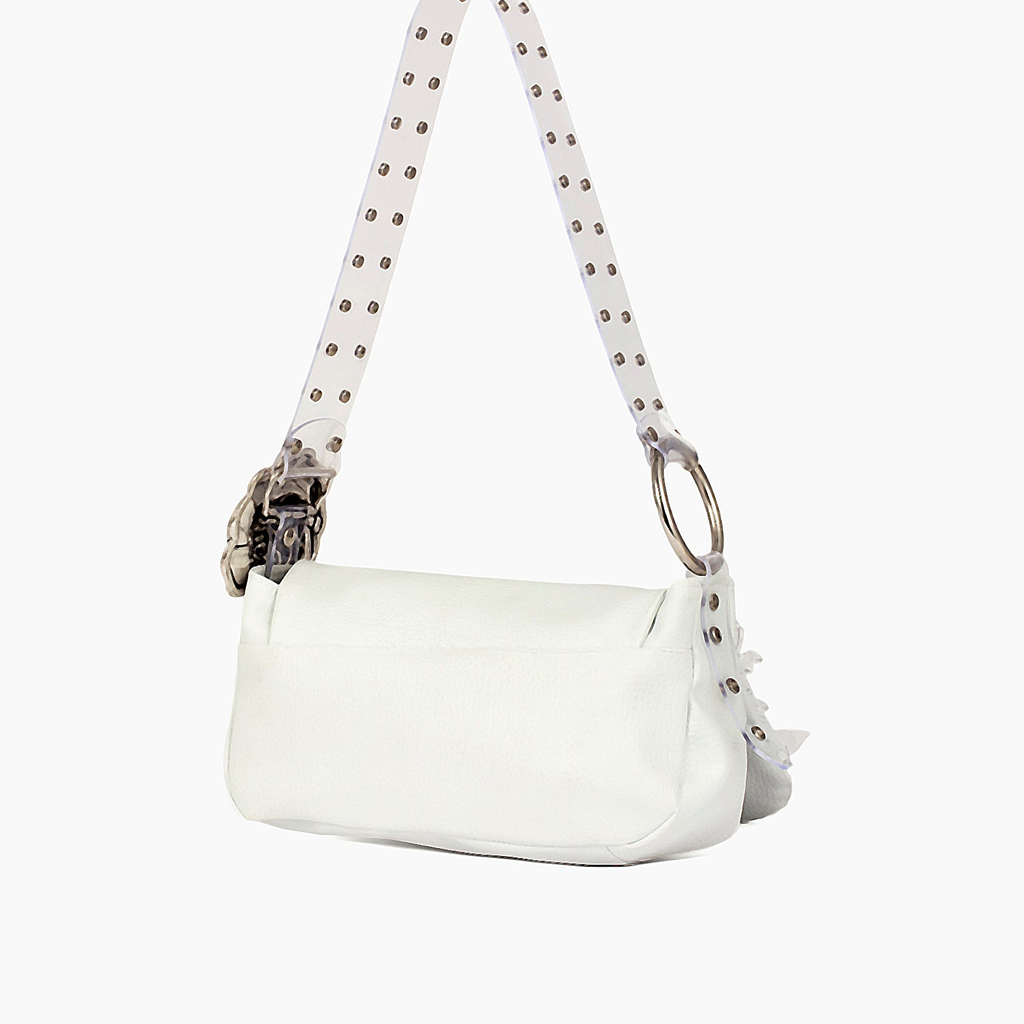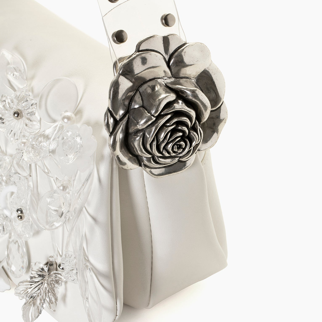 Supported by a 48cm long plastic crystal handle (5cm wide) adorned with studs and finished with a 925 sterling silver rose-shaped closure -