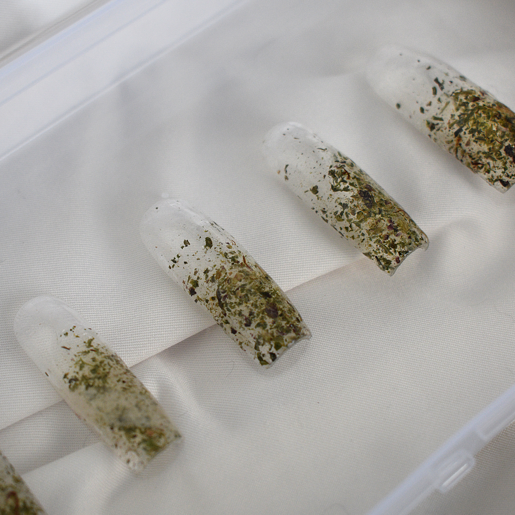 Hotnails666420 is an art installation, nail studio based in Montreal, Quebec seeking to explore themes of technology and the body through the social history of nail art. Hotnails666420 is creating nail sets using locally sourced deadstock objects and electronic components as well as hand painted and encapsulated designs. Most nail sets are 1/1 and will not be restocked.