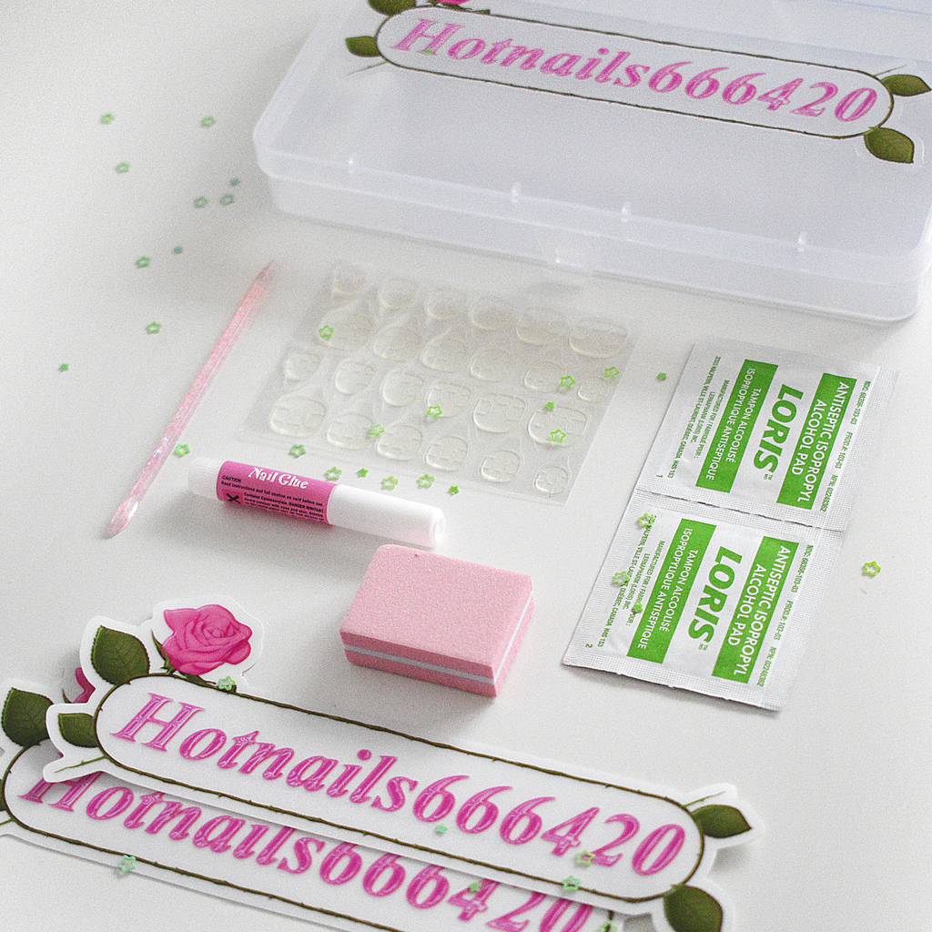 All nail sets come with 1x display box, 1x cuticle pusher, 1x buff block, 1x tube professional quality nail glue, 2x alcohol swabs, 2x sets of glue tabs, 2x Hotnails stickers.