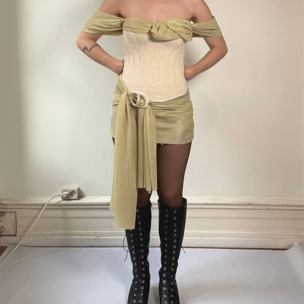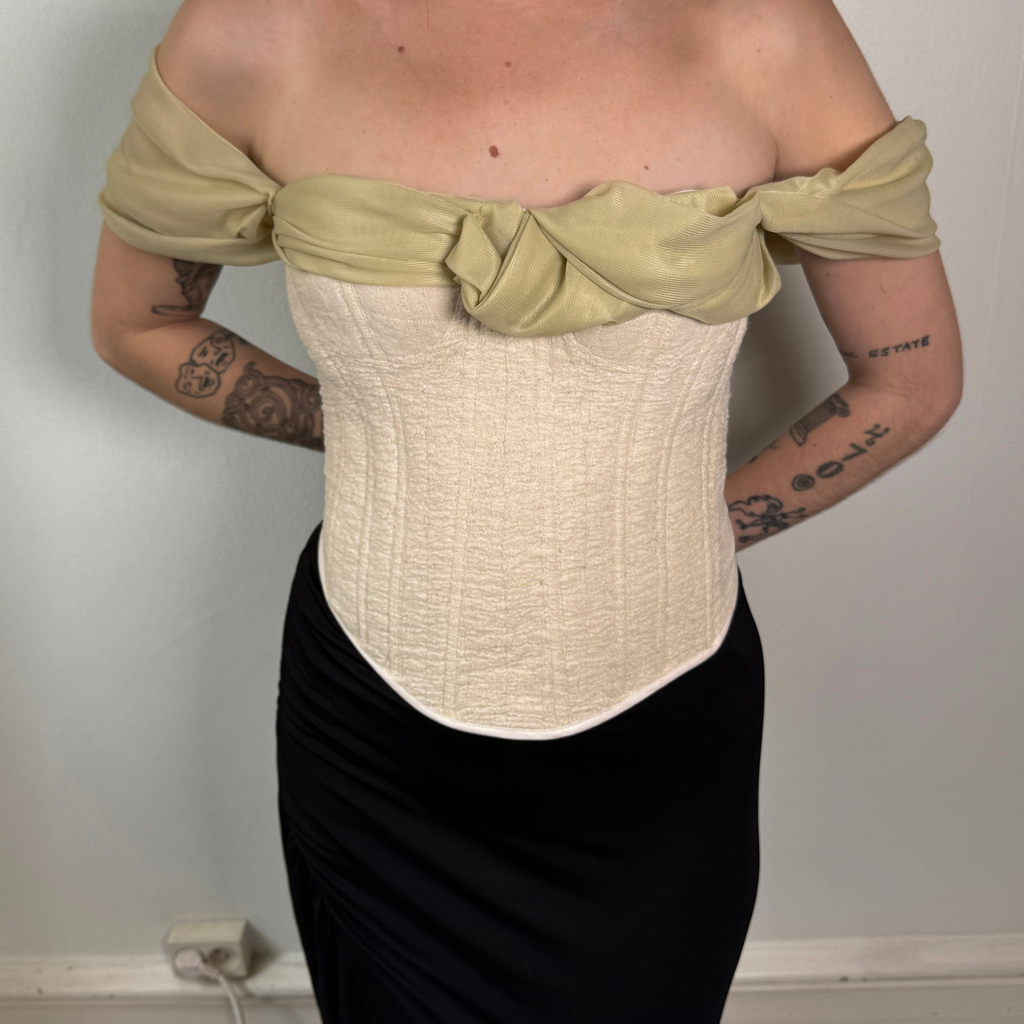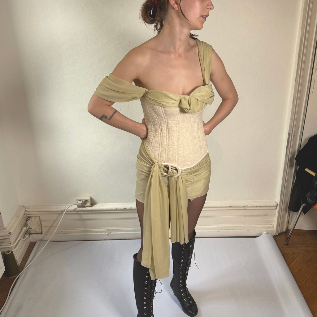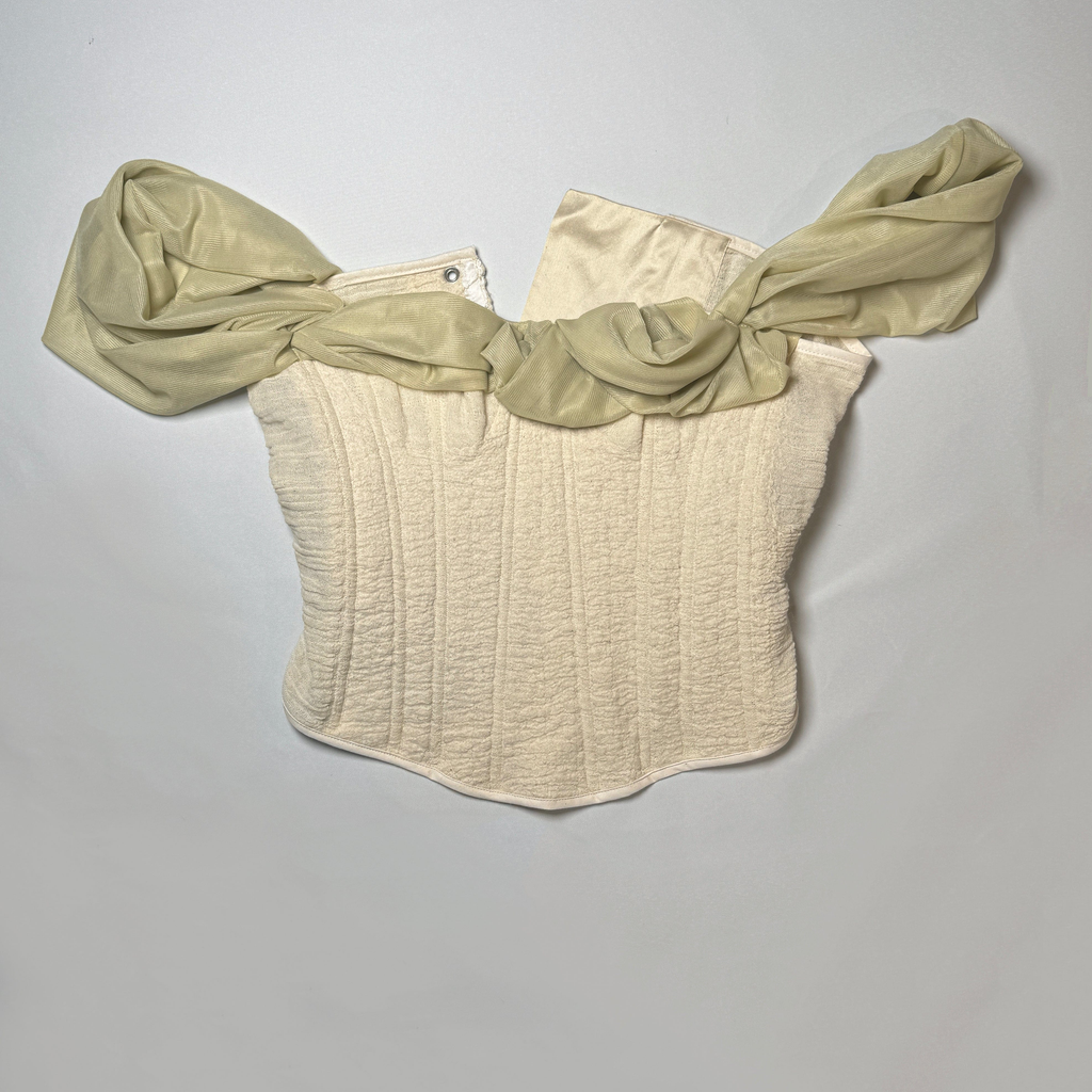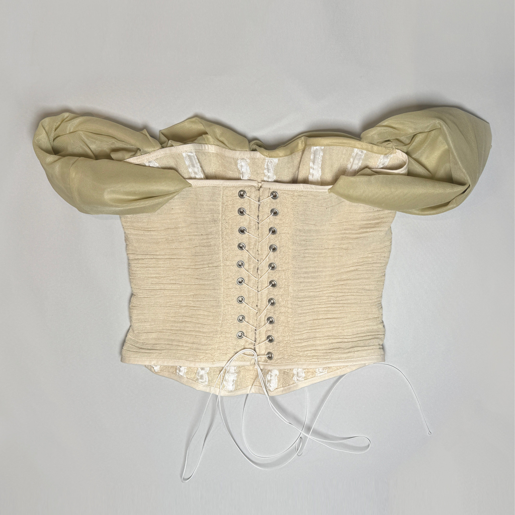 Crafted from shrunken wool and cotton gauze with softly draped viscose jersey straps, this corset top features internal boning and a lace-up back for adjustable shaping.