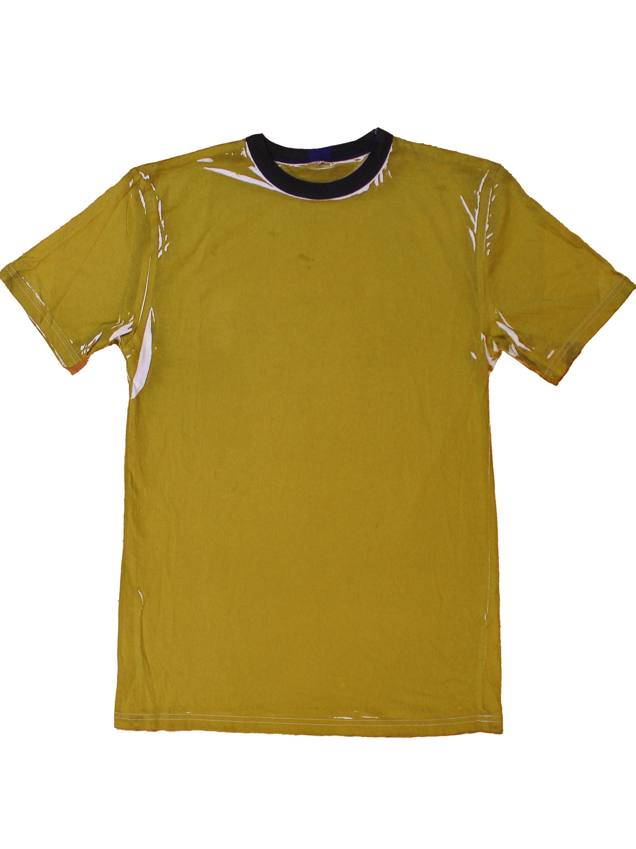 Reclaimed vintage deadstock 70s ringer tee allover printed with olive green textile dye. Creases are unpredictable and vary from tee to tee.