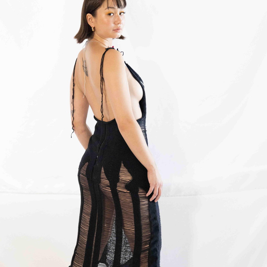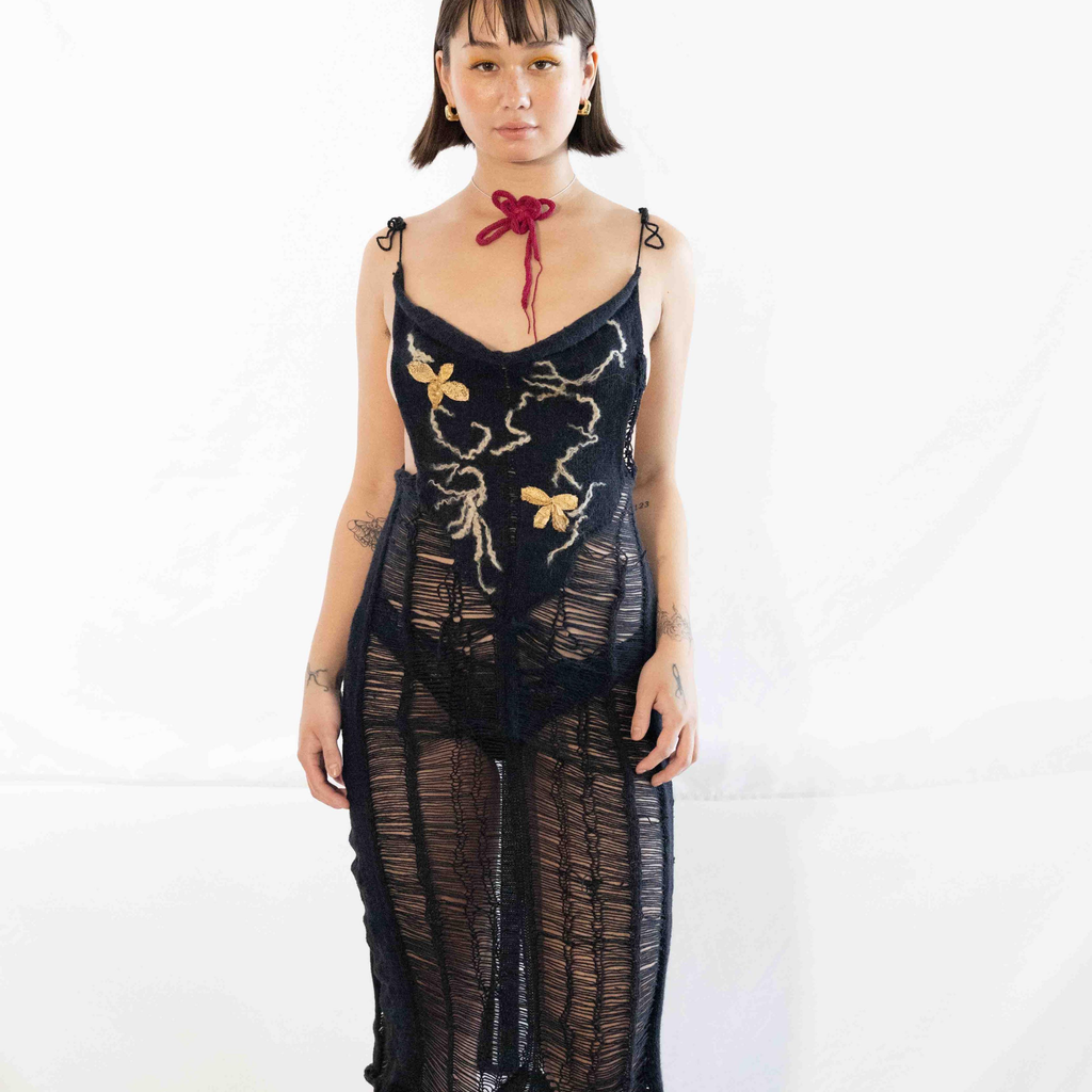 This Cocoon Drop Stitch Layering Dress is knit with two skeins of artisanal Japanese cotton. Felted with mohair locks from a goat named Peach sheared by a female artisan in Maryland. Finished with embroidered foraged wild goldenrod silk cocoons sourced in NYC.