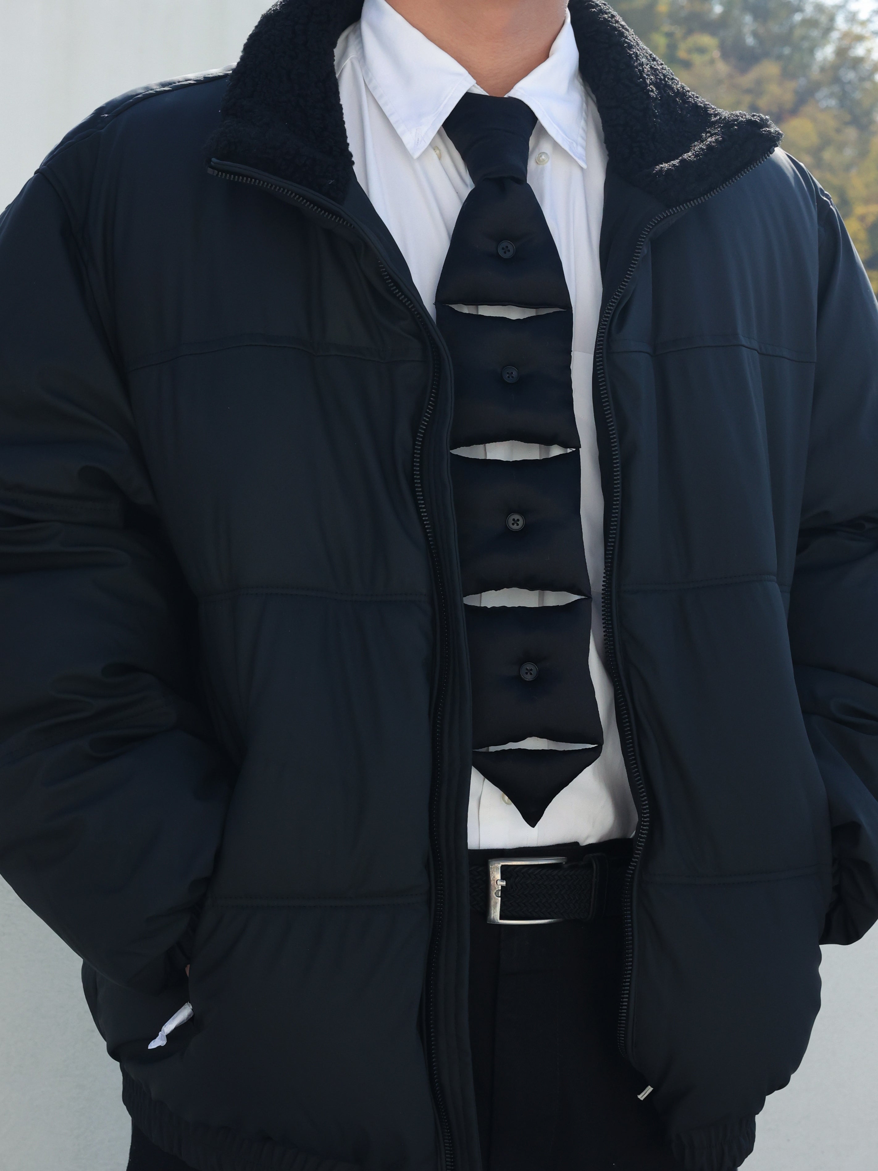 This is a silk necktie necklace reinterpreted in the form of a pillow. Each piece is handmade in our studio and shipped directly from there. It is crafted from satin silk fabric. The white version is finished with mother-of-pearl buttons, and the black version with horn buttons. The length is adjustable using the stopper at the back. It is lightweight with a soft, smooth surface texture.