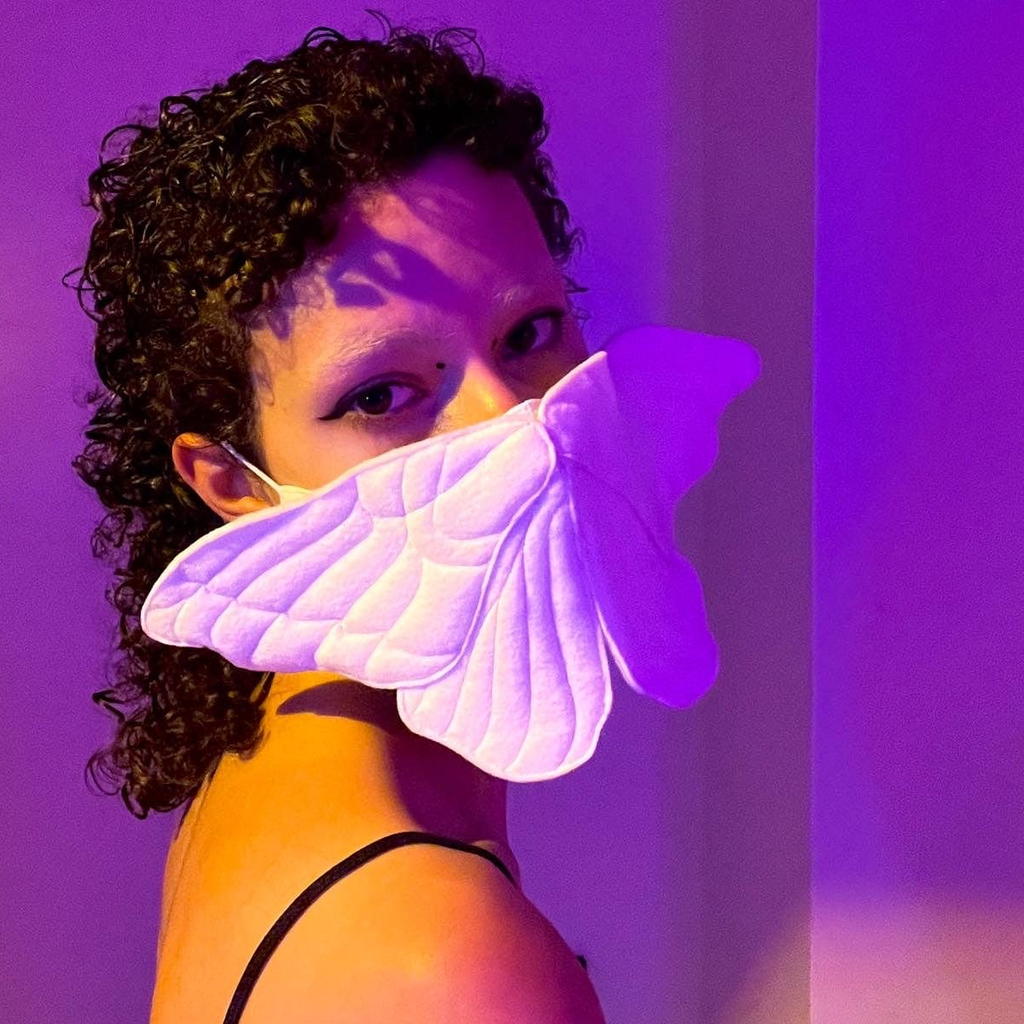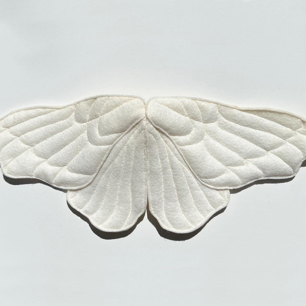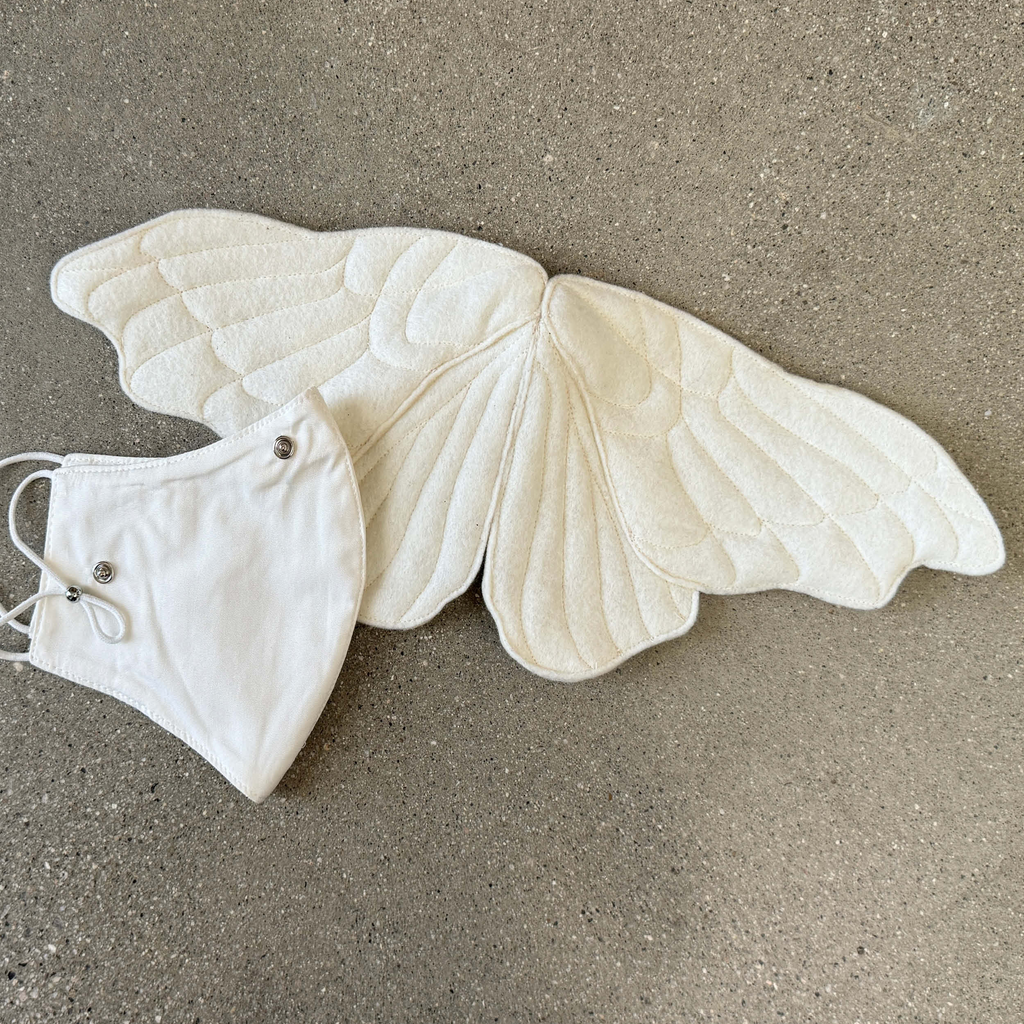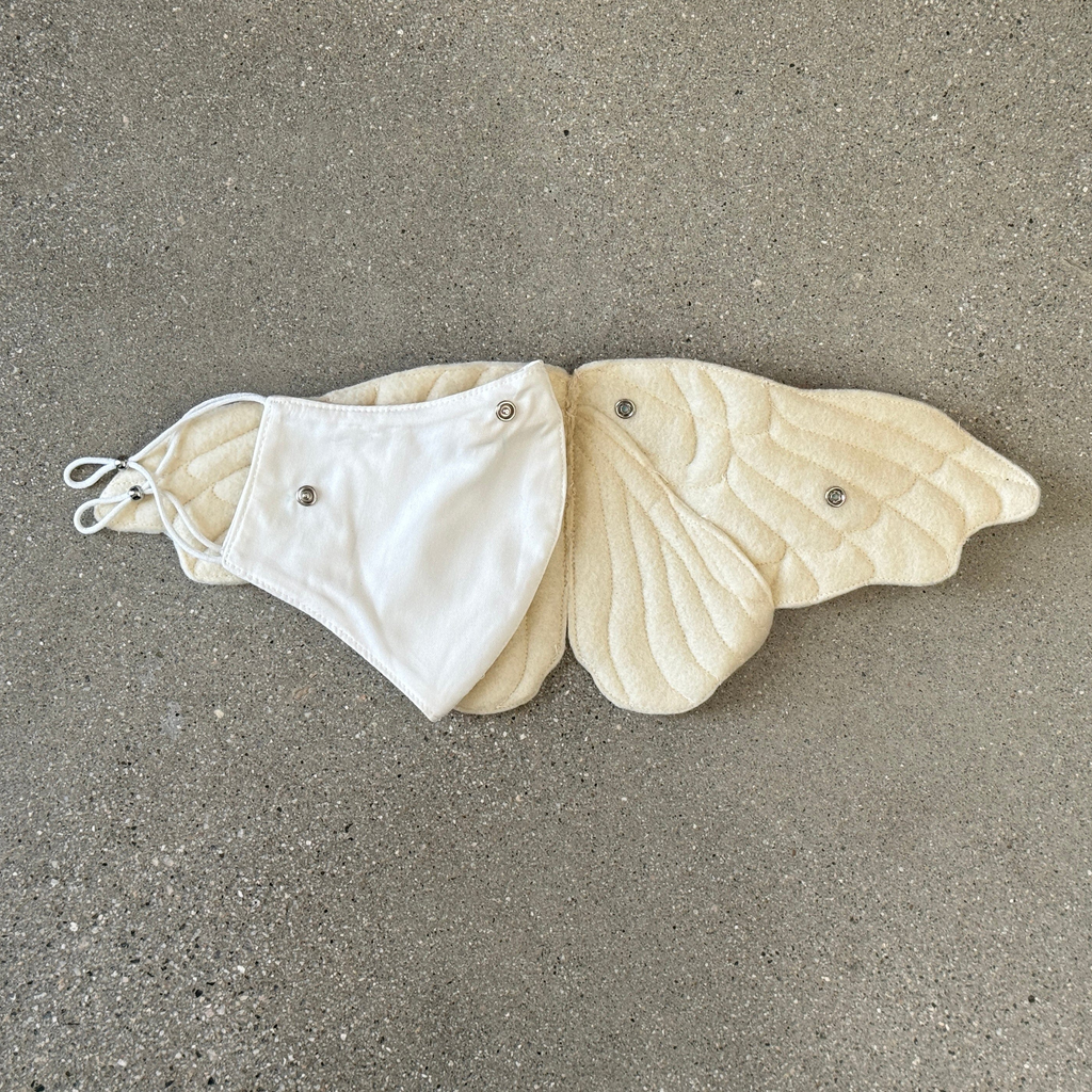 The handmade felt moth mask by Sila Ersayin is inspired by the silkworm moth (bombyx more). Comes with one cotton face mask with a sleeve for filter inserts. The moth is attached to the mask with metal snaps and can be removed.