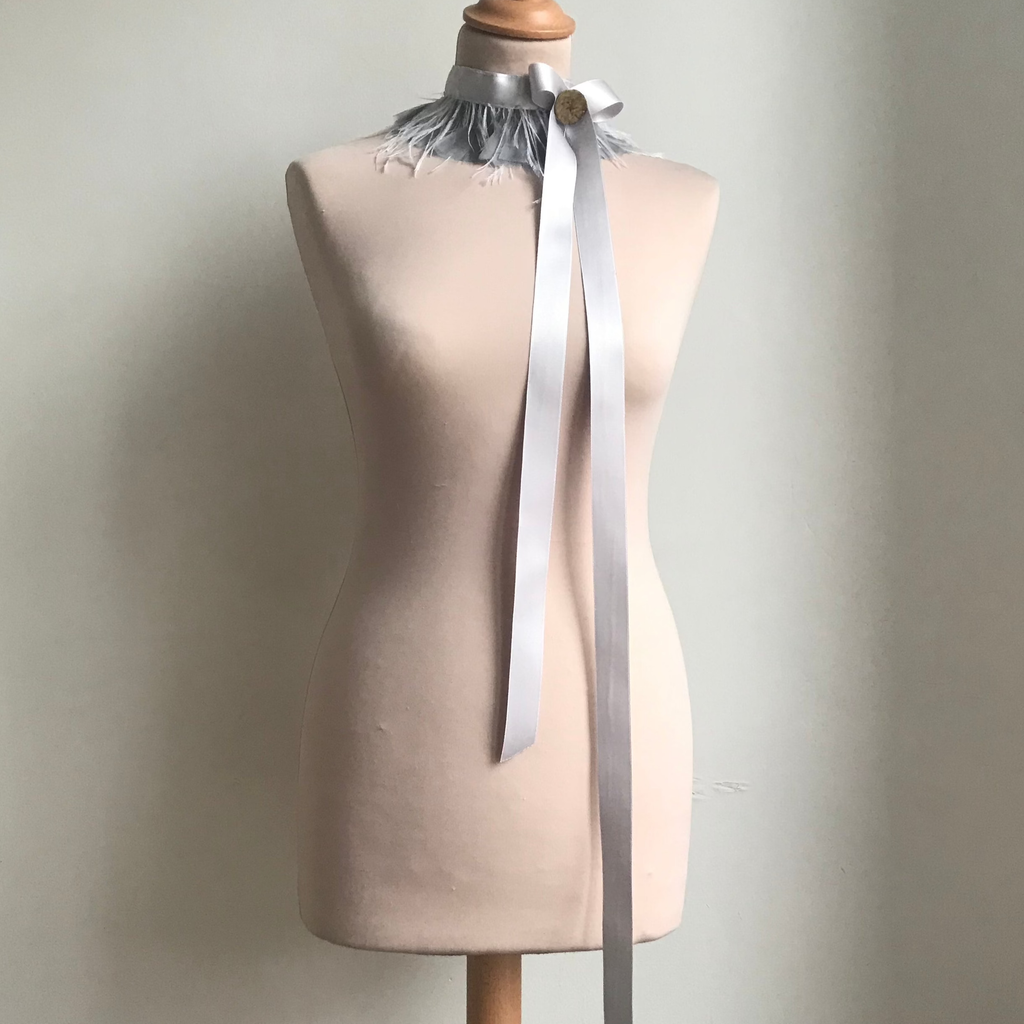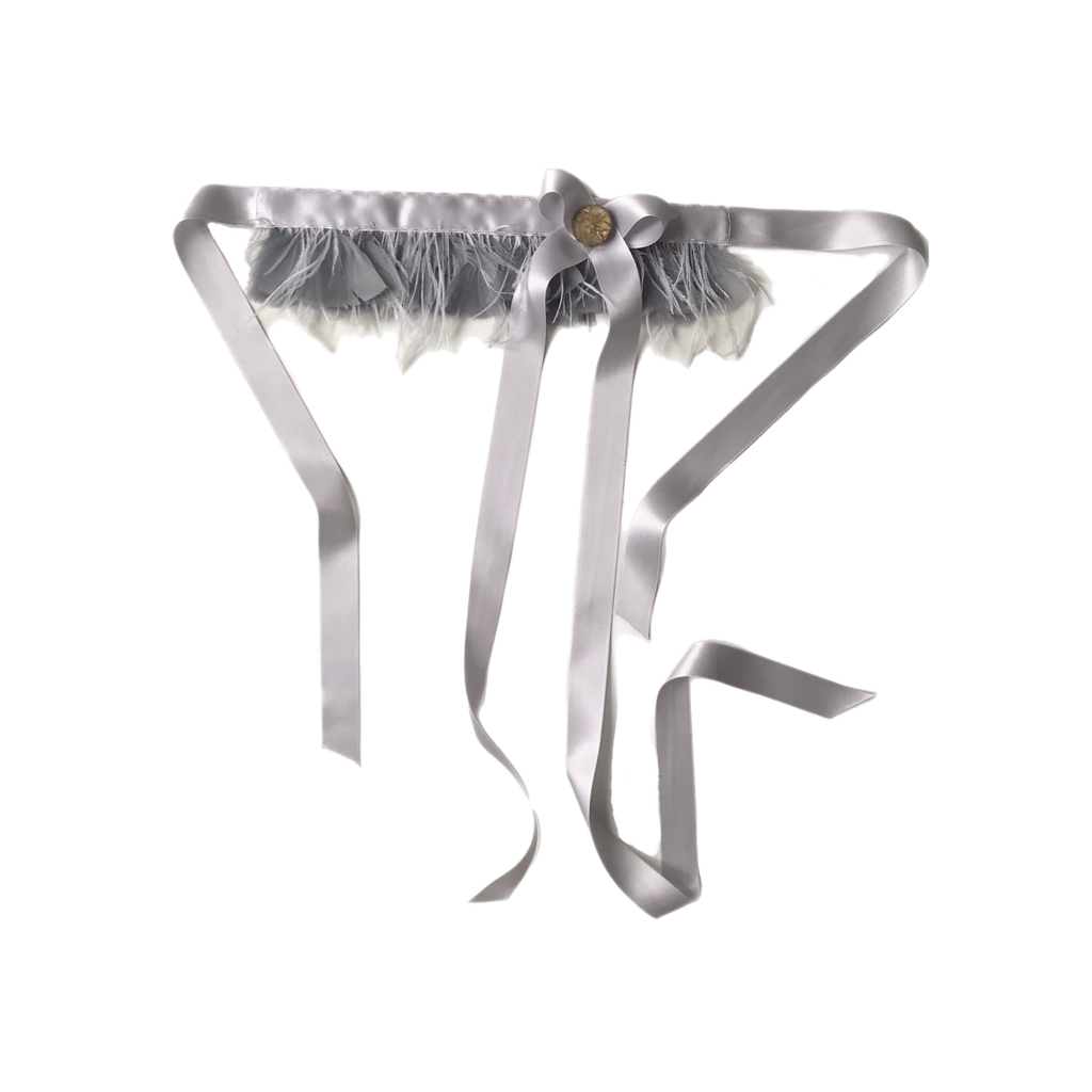 A ribbon neckpiece featuring two layers of real feathers, embellished with a bow and an antique hand-made button. One size fits all.