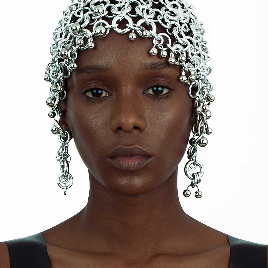 Metal headpiece handmade in São Paulo. All rings are aluminum so the piece is not heavy and is also very resistant. Since it is a mesh construction it adjusts to different heads. It can be washed with water and neutral soap if necessary.