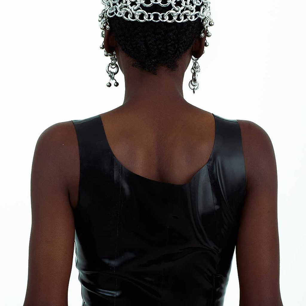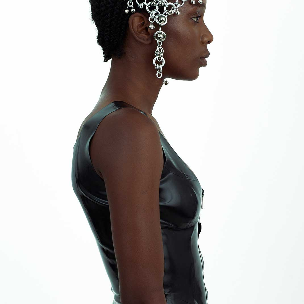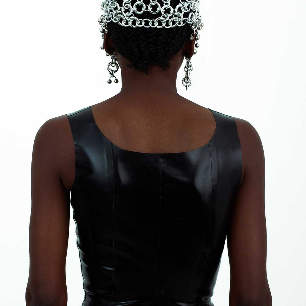 Jalaconda is a multidisciplinary artistic project, focused on the body. The LGBTQIA+ brand researches unconventional materials, such as latex, steel and natural Brazilian stones. They aim to discuss the place of manual work and personal adornment, knowing that clothes are fully political as they are from a country historically full of complexities.