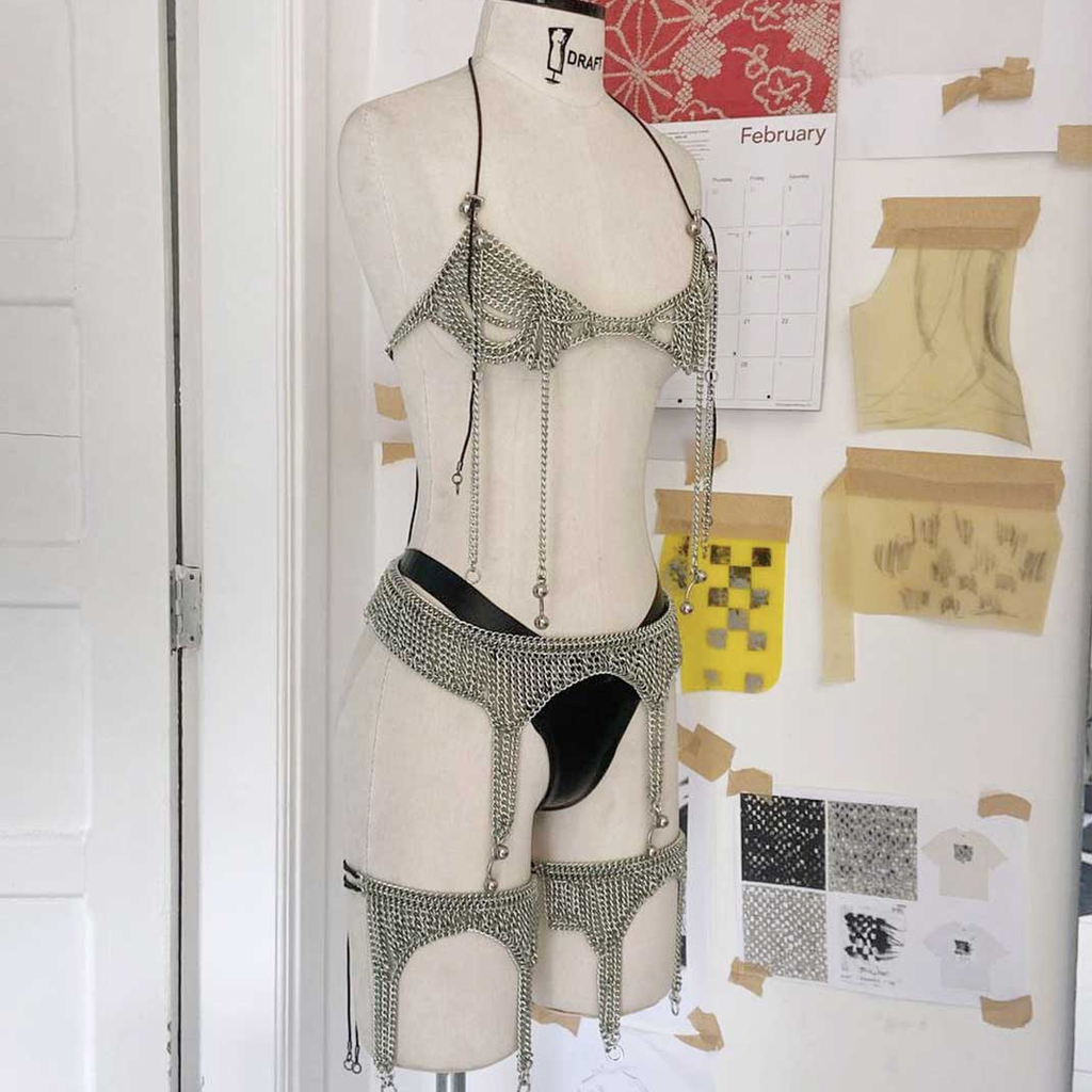Jalaconda is a multidisciplinary artistic project, focused on the body. The LGBTQIA+ brand researches unconventional materials, such as latex, steel and natural Brazilian stones. They aim to discuss the place of manual work and personal adornment, knowing that clothes are fully political as they are from a country historically full of complexities.