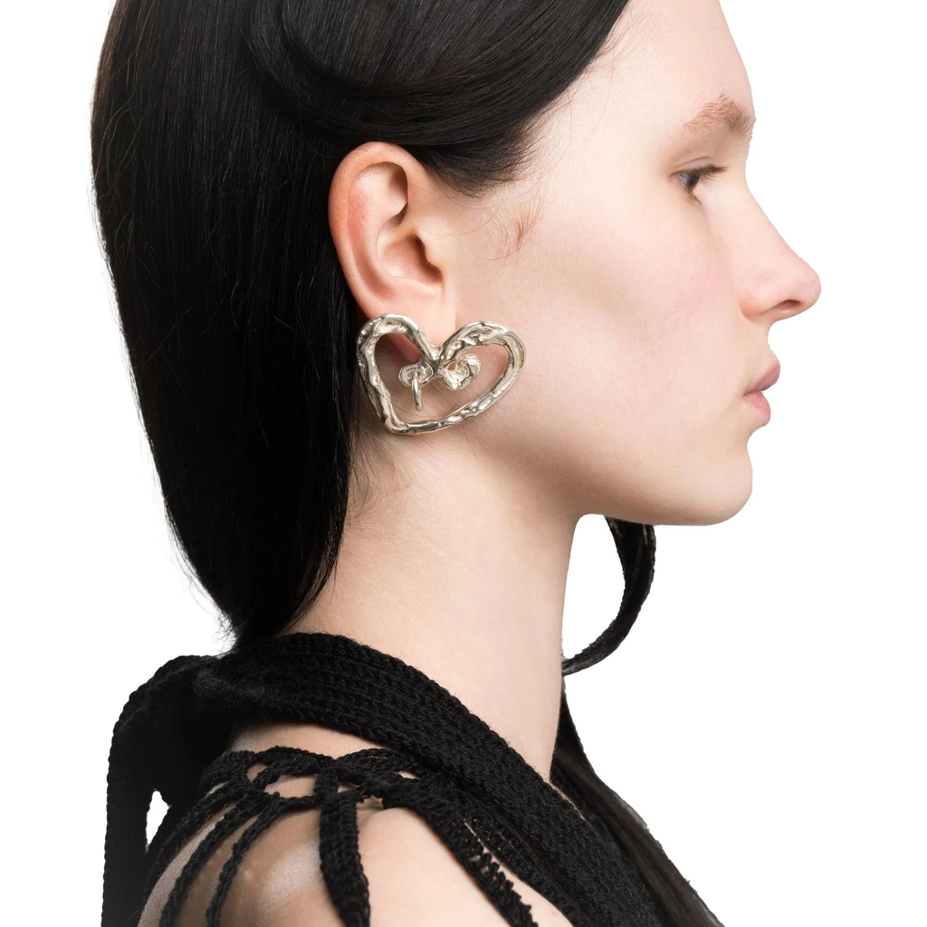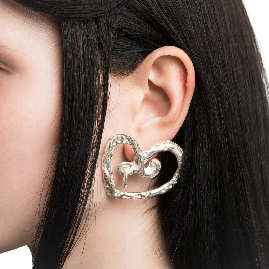 Silver plated bronze earrings. Our signature heart shape featuring a silver hoop.