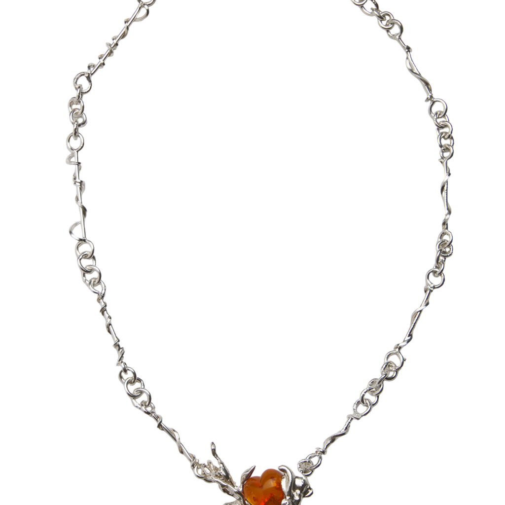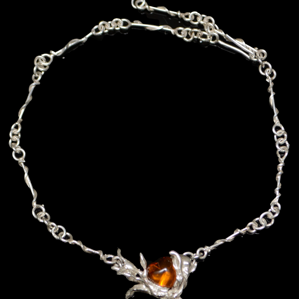 Handmade silver necklace with amber heart by Colombe d'Humieres.