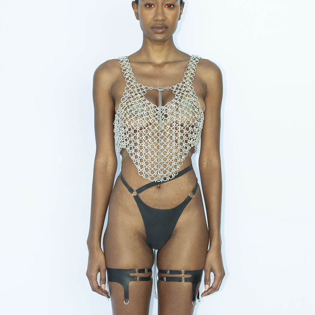 Jalaconda is a multidisciplinary artistic project, focused on the body. The LGBTQIA+ brand researches unconventional materials, such as latex, steel and natural Brazilian stones. They aim to discuss the place of manual work and personal adornment, knowing that clothes are fully political as they are from a country historically full of complexities.