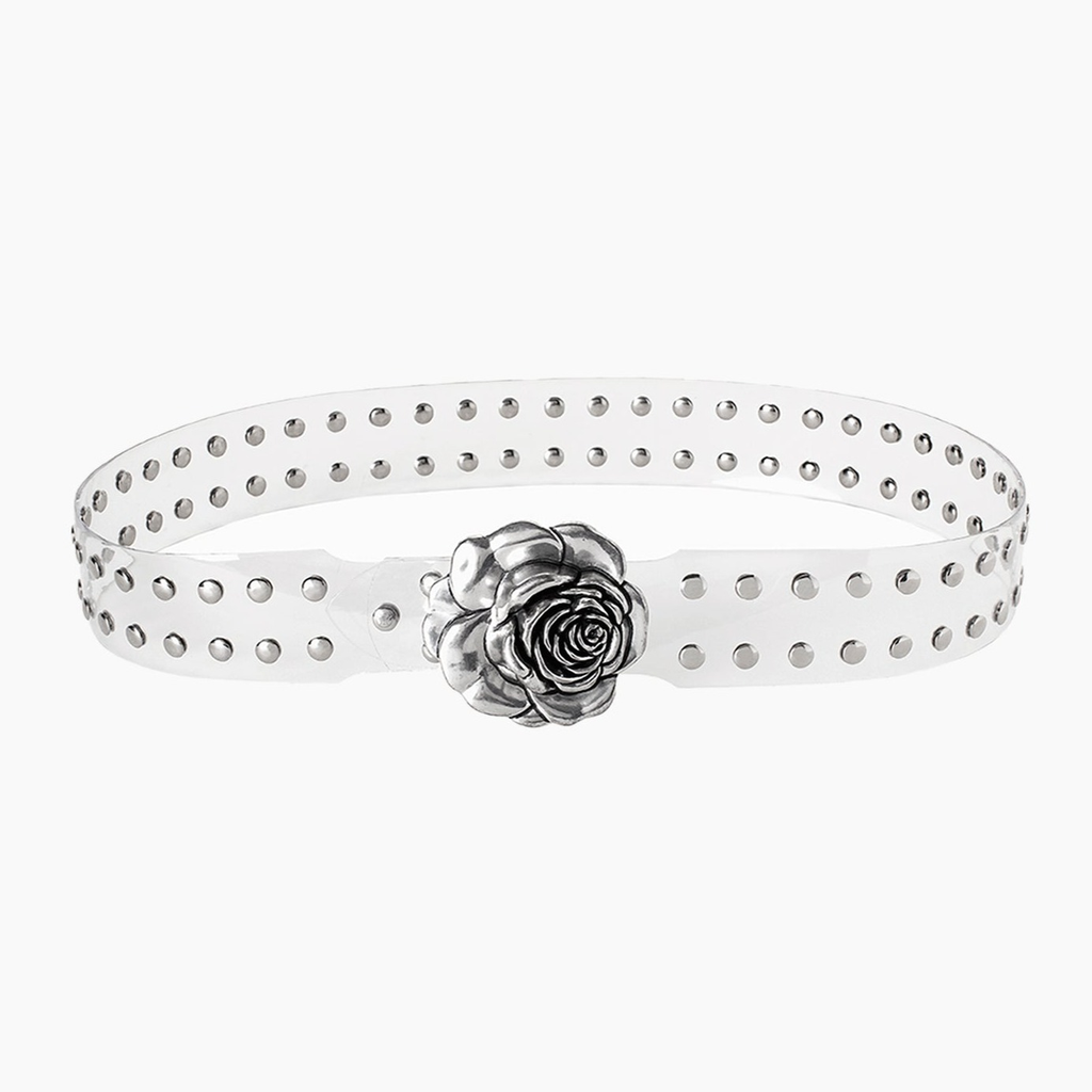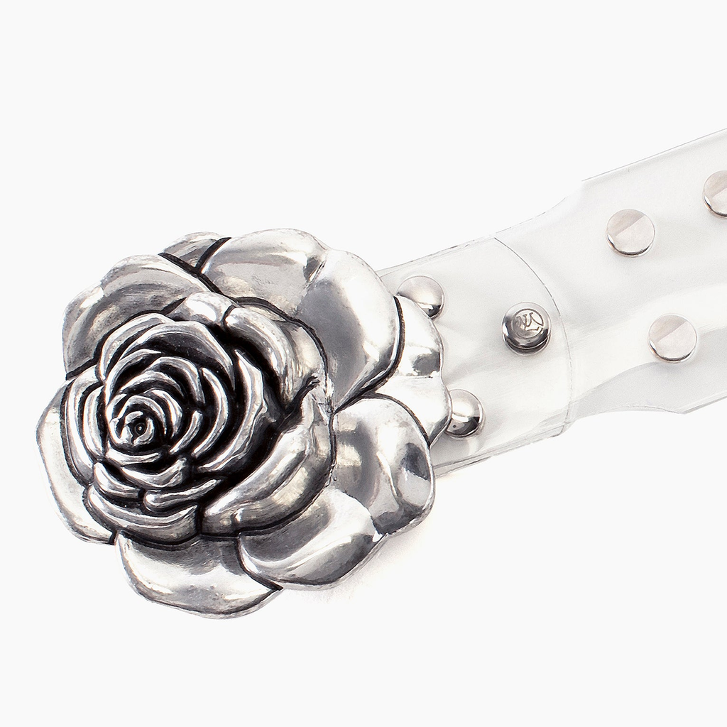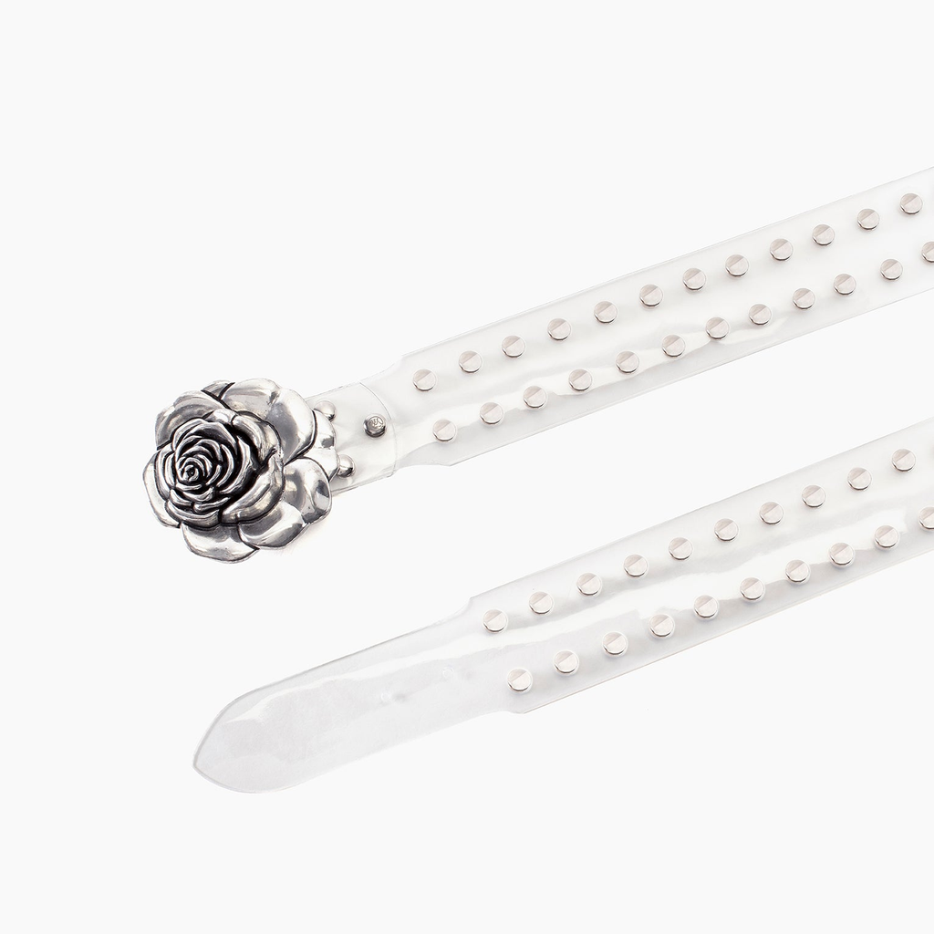 PVC Thermoplastic belt with added studs and finished with a 925 sterling silver rose-shaped closure.