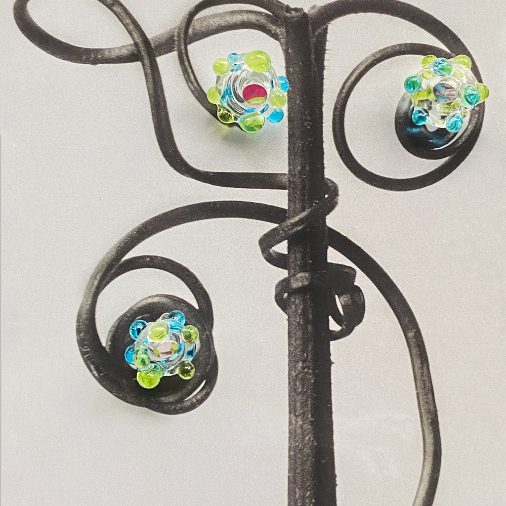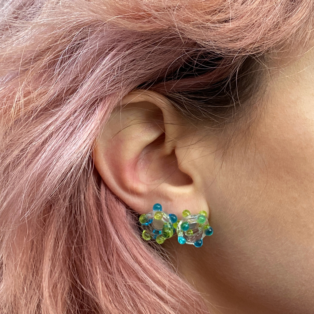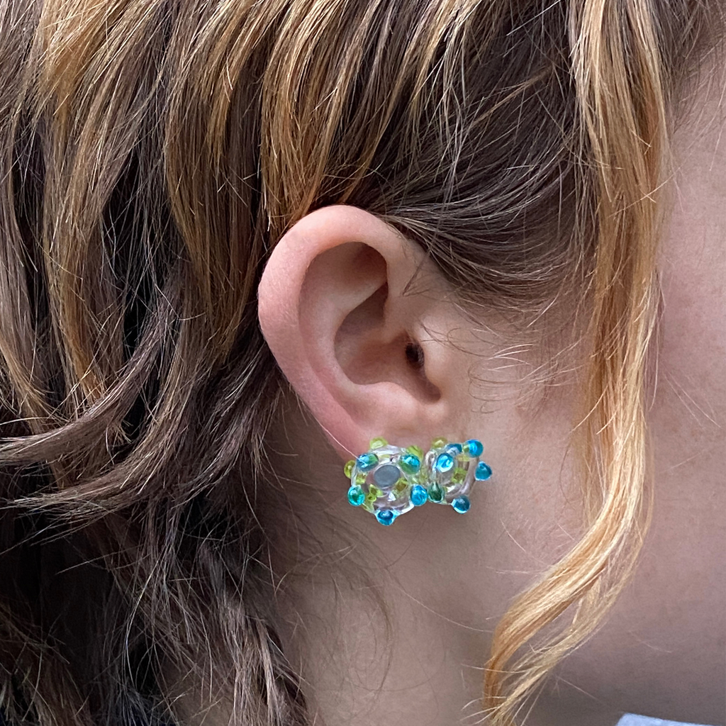 Set of handmade Murano glass earrings embellished with electric green and turquoise transparent dots, attached by a sterling silver stud.