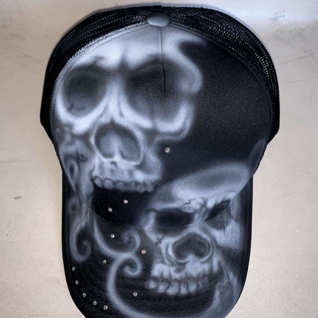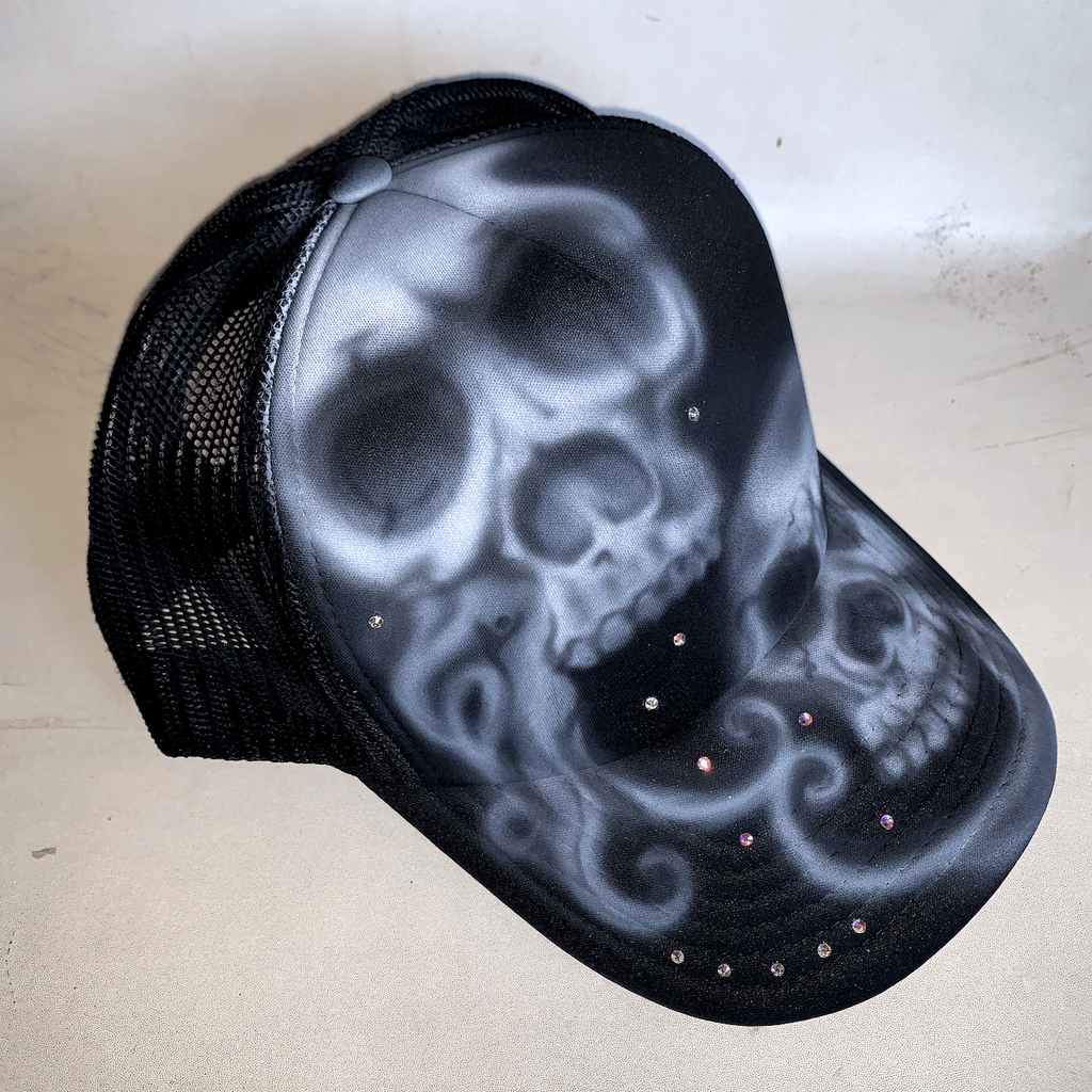 Hand-painted airbrush trucker hat with blue crystals, adjustable strap.