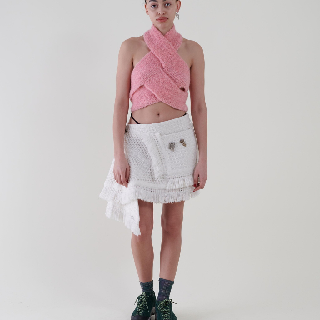 Sleeveless crochet top fashioned of a stripe made with a light pink wool and mohair blend yarn.