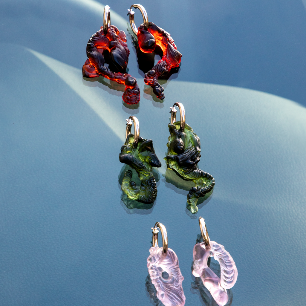 Vanessa Schindler is an eponymous fashion and accessories label based in Switzerland. A graduate of the Geneva University of Art and Design, Vanessa was awarded the Grand Prix d'Hyères in 2017 for her master's collection. In 2018 she turned to accessories and jewellery, leaving fashion to create her pieces by hand in her workshop. Her fourth jewellery collection 'Bioresin Hoops' stems from experiments with wax in water that create abstract, organic forms she likes to describe as sci-fi fossils.