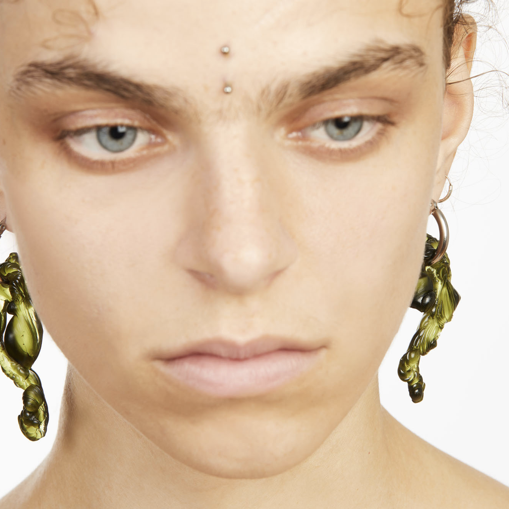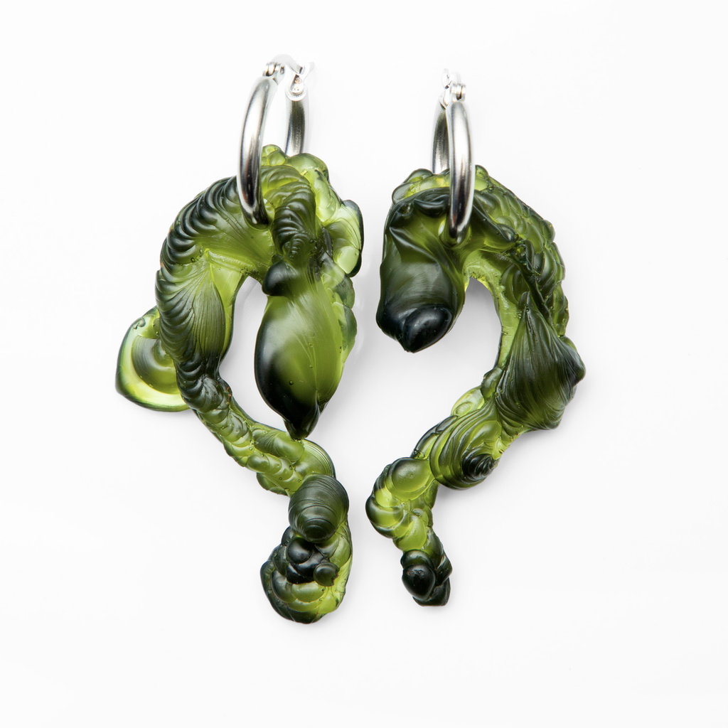 Vanessa Schindler is an eponymous fashion and accessories label based in Switzerland. A graduate of the Geneva University of Art and Design, Vanessa was awarded the Grand Prix d'Hyères in 2017 for her master's collection. In 2018 she turned to accessories and jewellery, leaving fashion to create her pieces by hand in her workshop. Her fourth jewellery collection 'Bioresin Hoops' stems from experiments with wax in water that create abstract, organic forms she likes to describe as sci-fi fossils.
